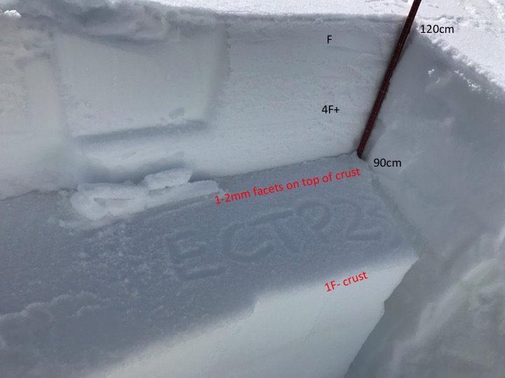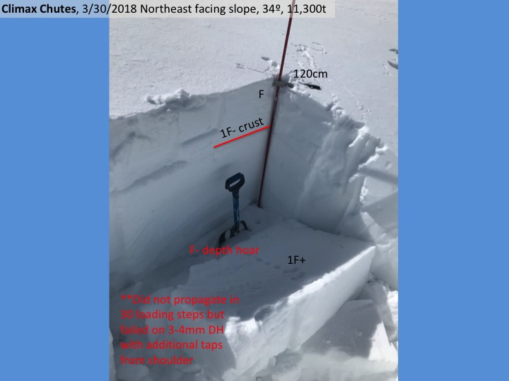 Snowpack: Snowpack continues its spring transition with these warm days at lower elevations but not much warming near treeline with cold wind and late afternoon cloudiness. Poor structure remains, and the shallower instability was reactive with extended column test (ECTP23) at 11,300ft, NE facing near CB. The deeper, scary depth hoar buried near the ground (100cm deep), remains cold, sharp-angled and unconsolidated. Minimal wind slab development in the near treeline ridgeline I traveled, though snow was blowing. Lower elevations at 1430 were becoming push-a-lanchy in the old, rain-saturated transformed snow once last night’s refreeze broke down.