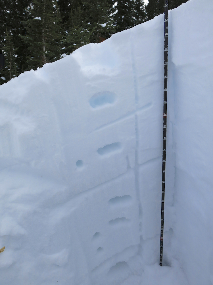 Snowpack: No collapses or obvious signs to instability. Traveling on slopes in the upper 30 degree range at all elevations traveled. Previous ski tracks in the area where on similar slopes in the upper 30 degree range and skiing through previously wind-loaded terrain. HS was generally in the 130cm range.