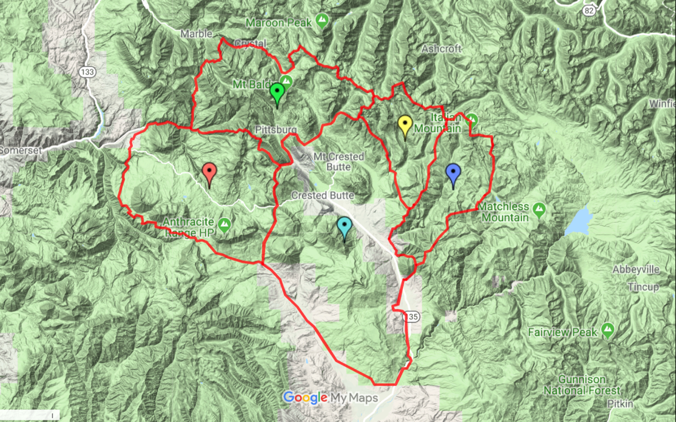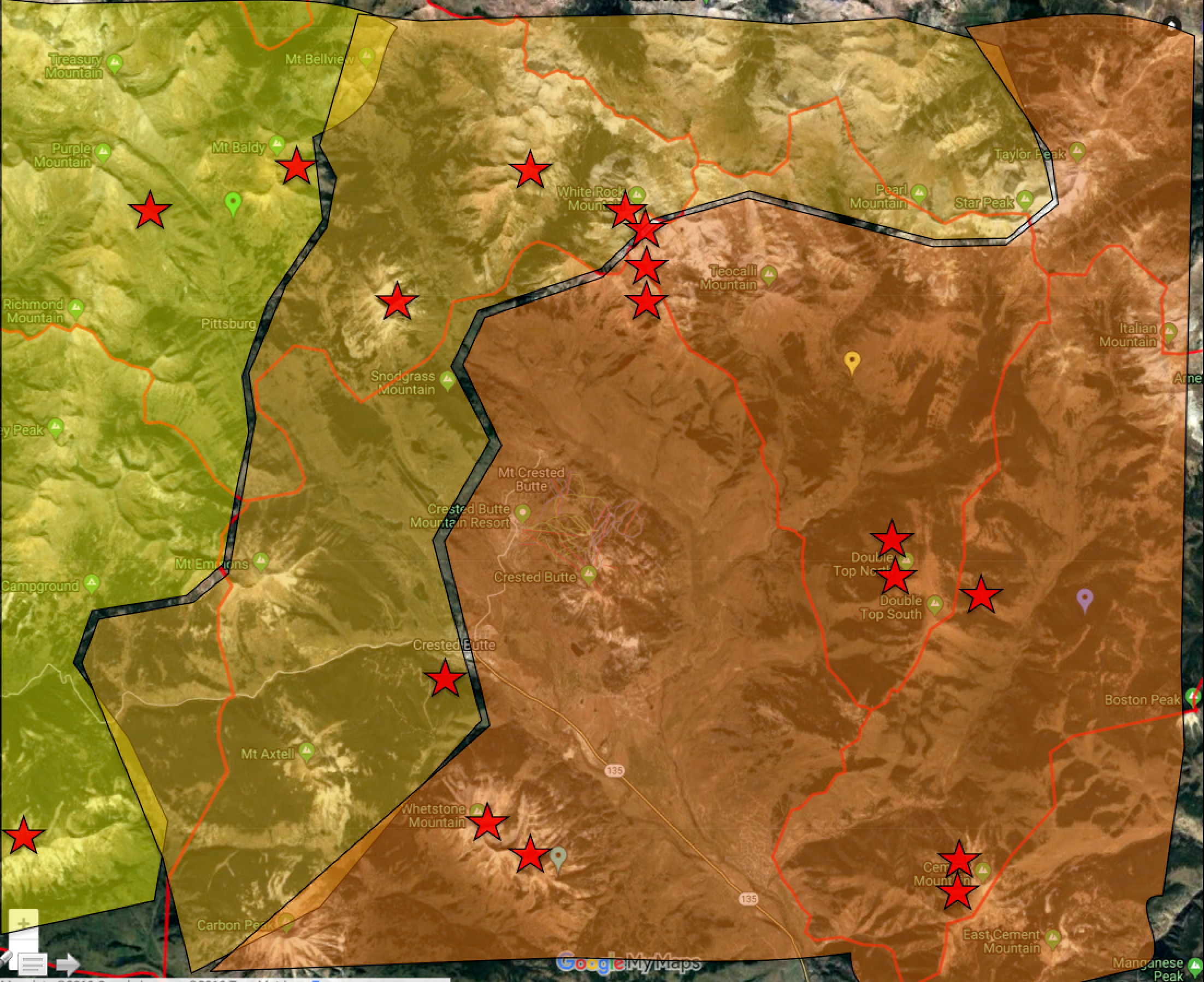 As illustrated by the red stars, there have been many more large to very large avalanches in the eastern portion of our forecast area. The greatest uncertainty lies in these transition areas in a band from Gothic, to Washington Gulch to Mount Emmons, to Mount Axtell. Â