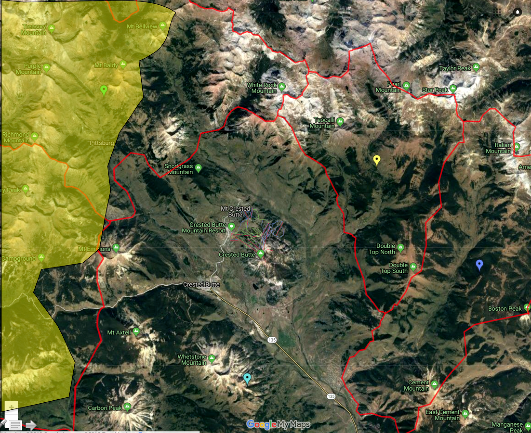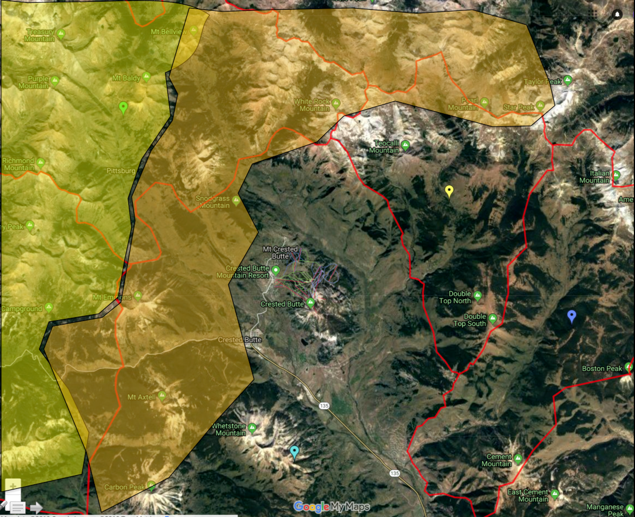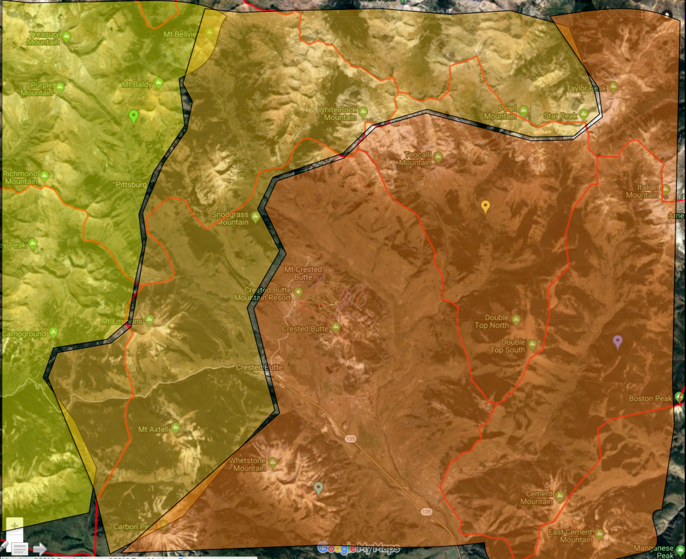 As communicated in daily avalanche forecasts, the threat of greater (larger and more widespread) avalanche activity (both persistent slab and wind slabs) in the shallower snow-covered areas near and east of Crested Butte is symbolized in this visual interpretation.