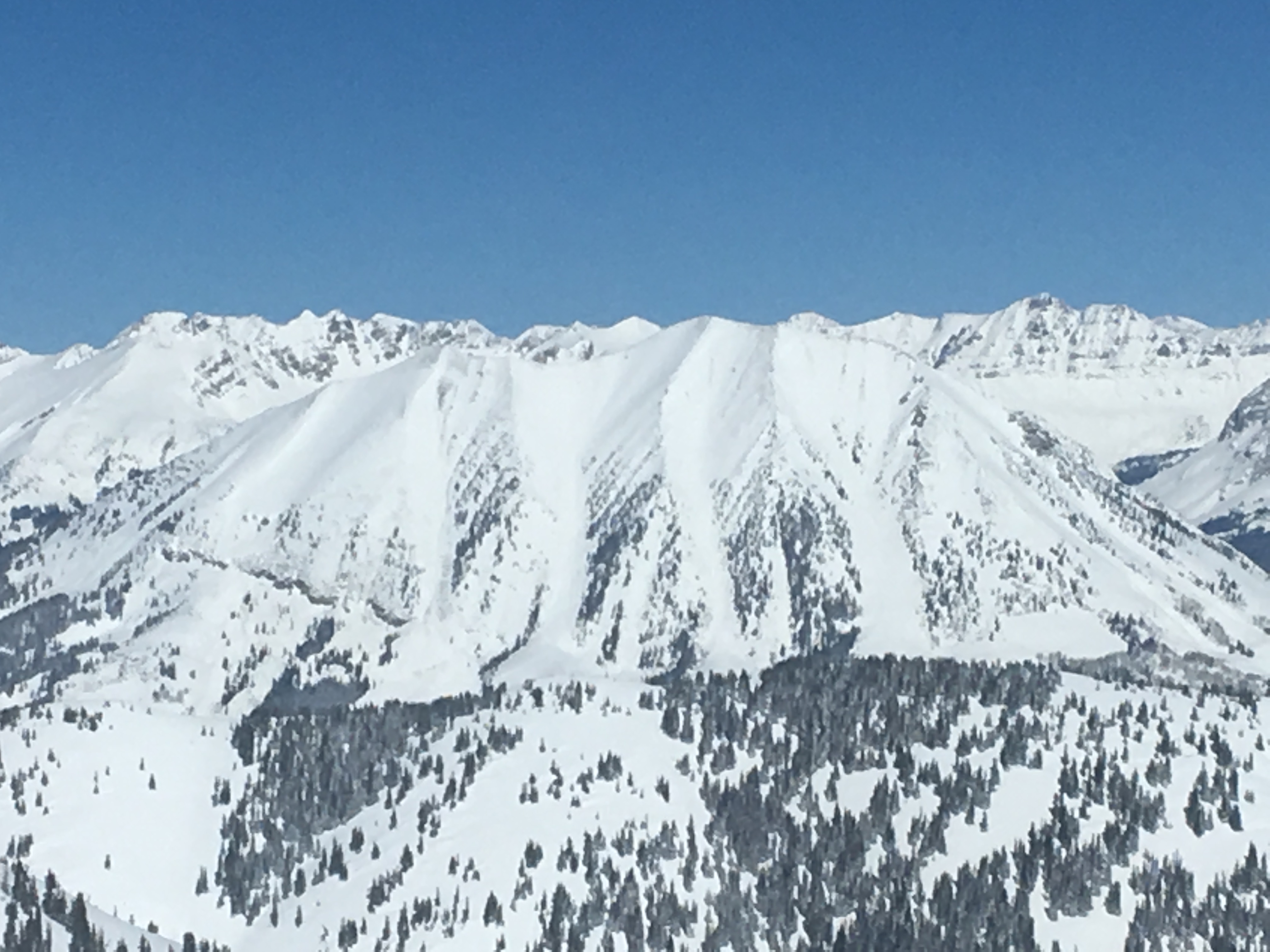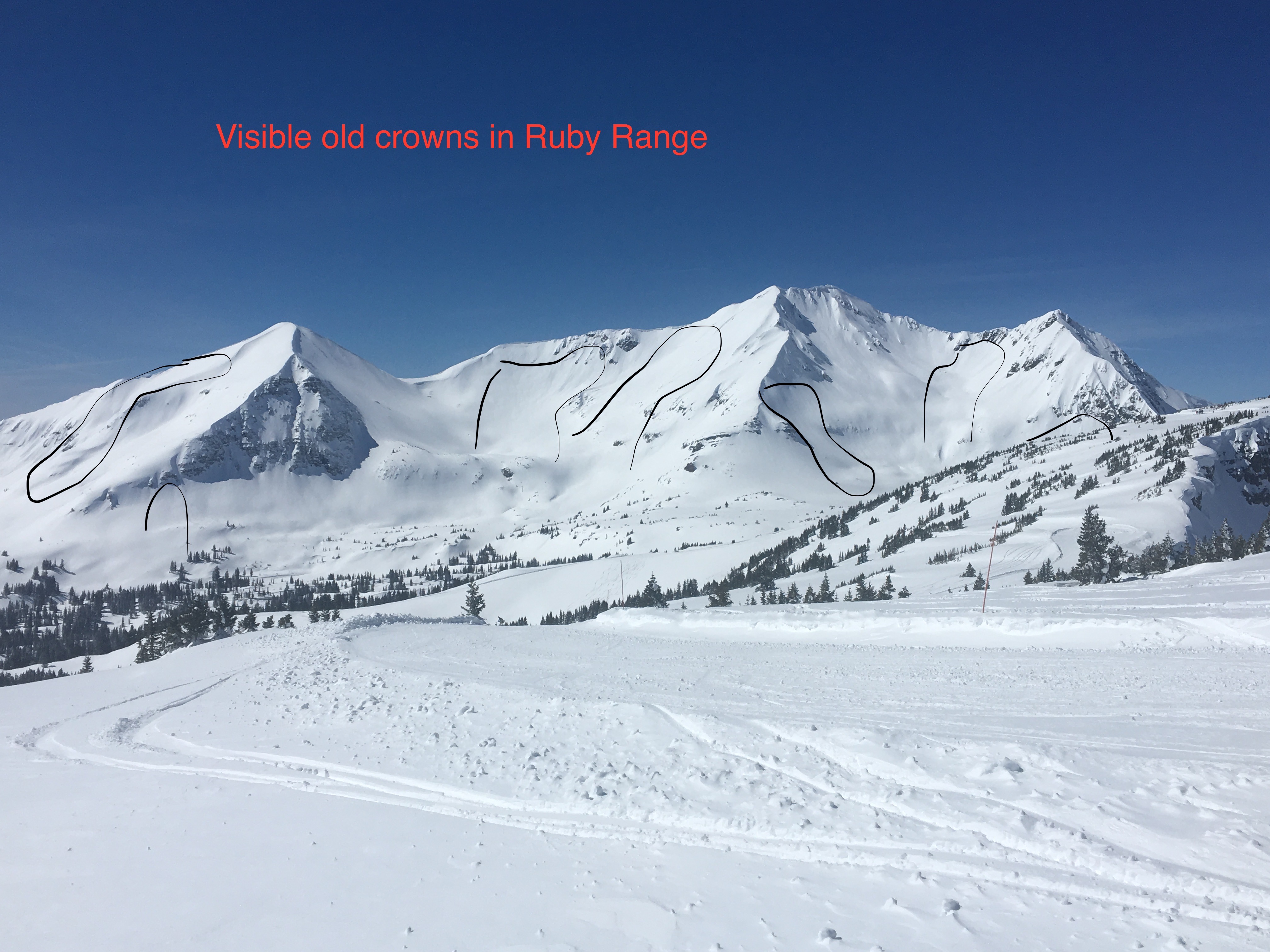 Some new, small loose avalanches noted from steep, sunny rocky terrain. Lots of older, mostly filled in crowns noted in the Ruby Range, Anthracites area, Scarp Ridge and Gothic Peaks. These looked in the D3 range with wide propagation and failing mid slope, below corniced ridges and in odd places.