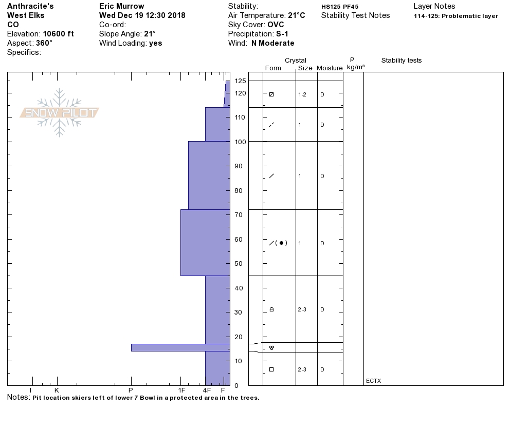 Snowpack: “Little bit of blowing snow.” Windward slopes becoming wind scoured with strong gusts disrupting the surface hoar. Old tracks still visible on all aspects observed there was some small wind slab development on NE aspects but isolated to areas NTL. Not too much wind loading observed on S aspects 3-4 inches of new on top of a 1″ crust. Saw no signs of instability through the day. Dug one PIT N aspect 10,400′ ETCX burping the burping the baby to see the reactivity of the newly buried surface hoar (profile attached). This will be a layer to pay attention to in the future after our last period of high pressure.