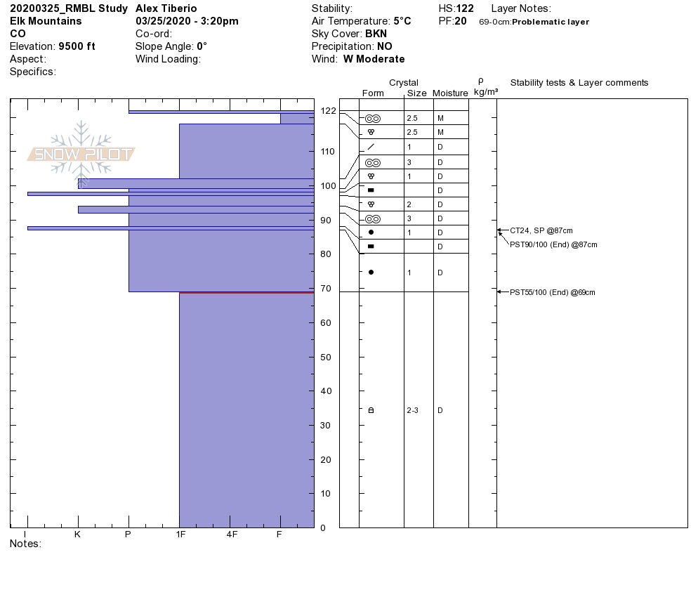 Snowpack: Snowpack at Elkton Study Plot was deepest of the year at 185cm. 3/18 interface is a thick 6 cm crust with 1mm rounding facets on top and is down 35 cm with 4F to 1F slab on top. CT 16 SC, ECTN28(crossed column on taps 29,30). All other interfaces have seen free water in this location.