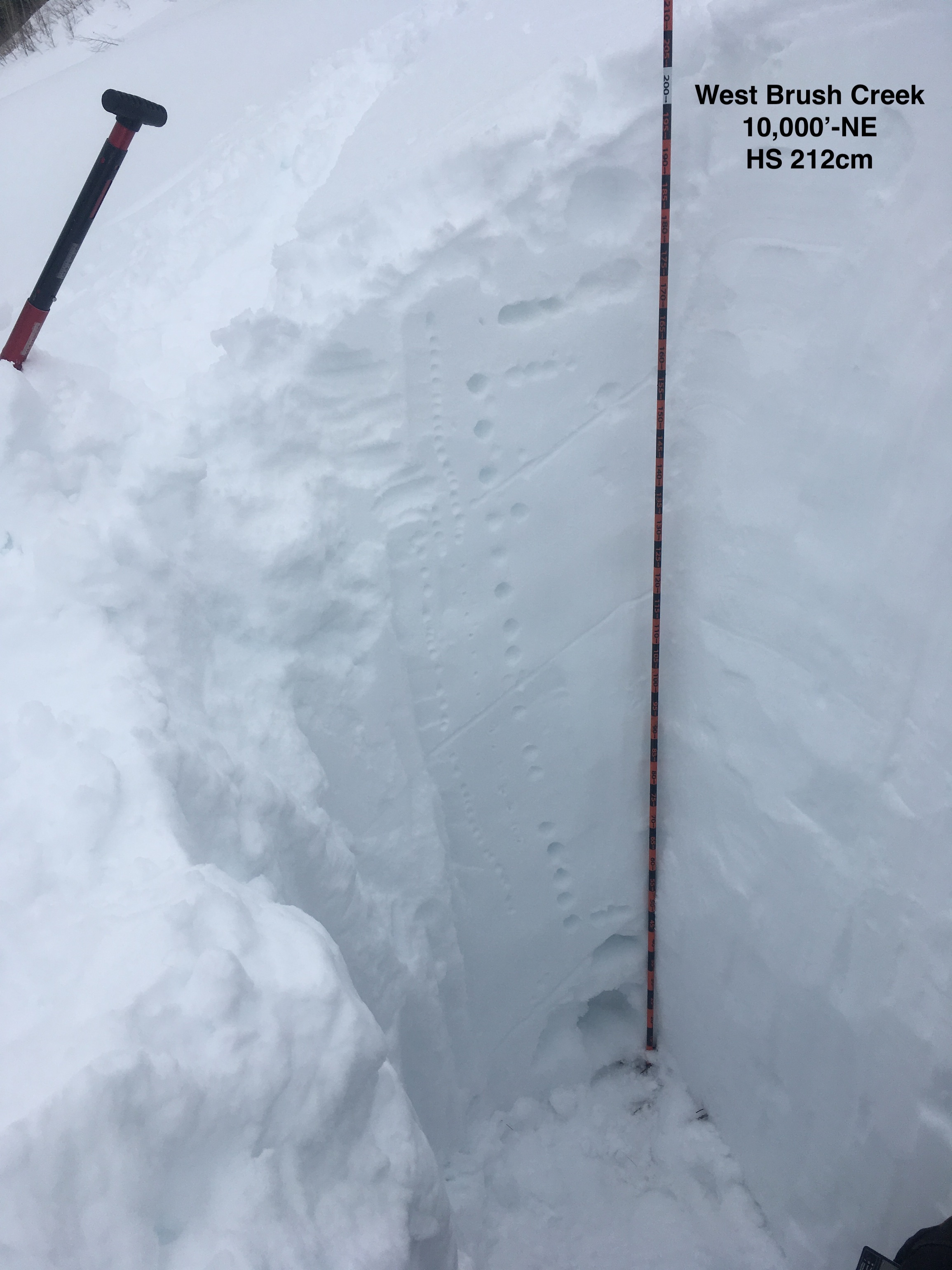 Snowpack: Went out lower Brush Creek and West Brush Creek. Poked a couple of holes. Lower Brush Creek near valley bottoms at 9,200′ had HS around 160cm. West Brush Creek at 10,000′ HS around 210cm. Main Brush Creek area was a SE slope – here the layer of concern were well developed basal facets. February and March snowfalls have created a thick slab just over a meter thick. Crusts in the mid-pack did not show much sign of faceting above or below. No concerning test results in upper snowpack – there looked to be a little faceting above and below dense rain-wetted snow from 3/6 down about 30cm – ECTN.