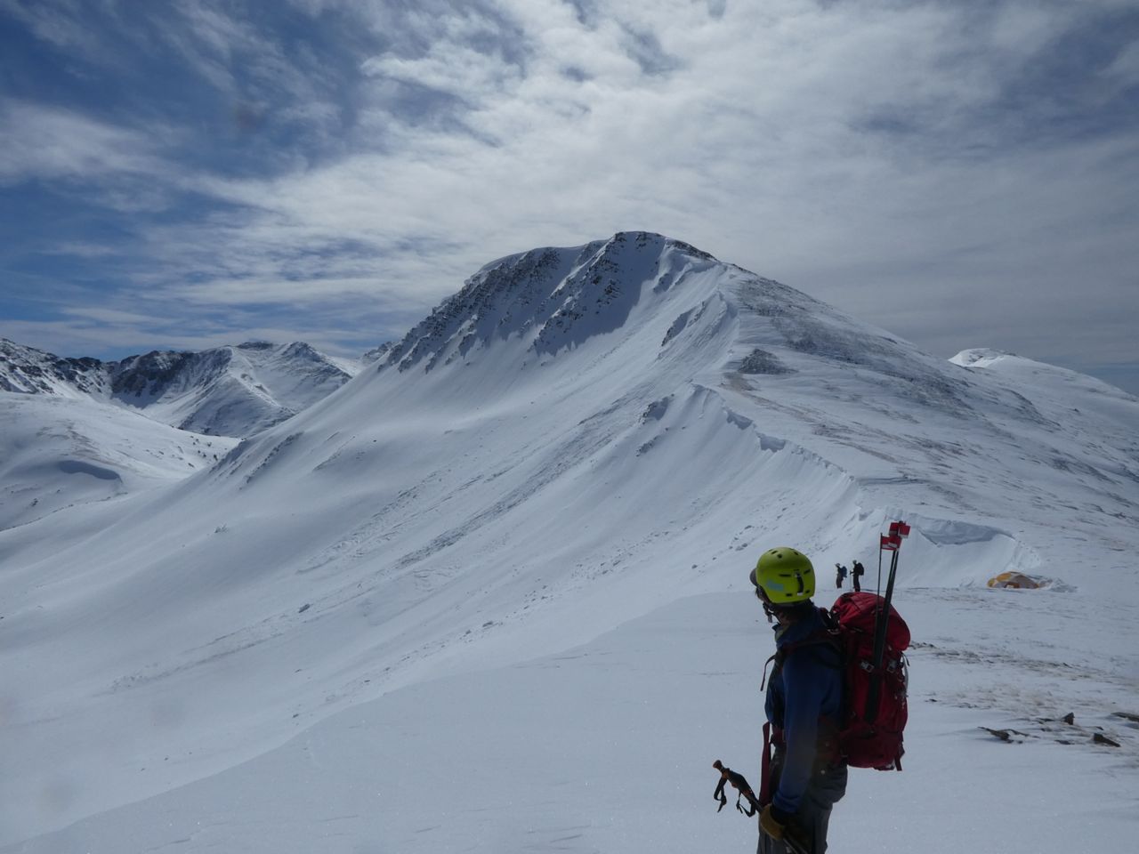Top of Right Chute, North aspect, 11,300′ HS 185 cm, mid pack was mostly rounded grains 4F-1F. Weak layer at ground was ~ 30cm of slightly moist, rounding DH that is still fragile(See picture).