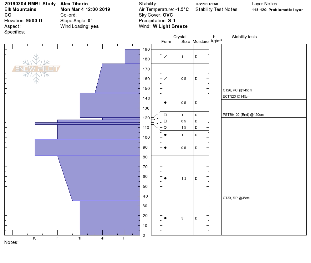 3/3: Kebler Pass area. Again traveling on smaller terrain with slopes up to 200 feet in vertical and in the mid 30 degree range. All terrain was BTL and in the Kebler Pass or Irwin Area. No Storm Slab or Persistent Slab issues observed in this lower elevation and smaller terrain.