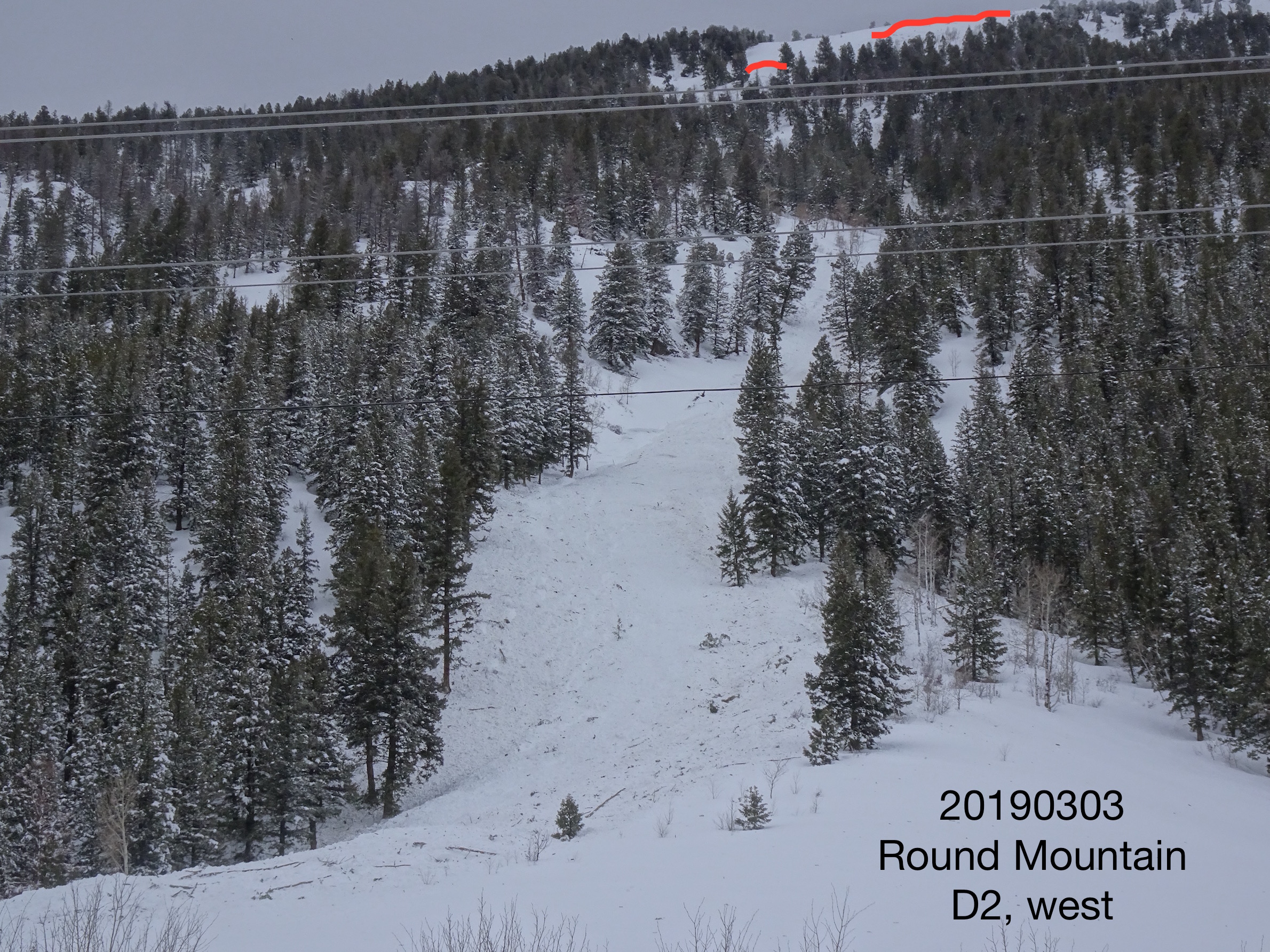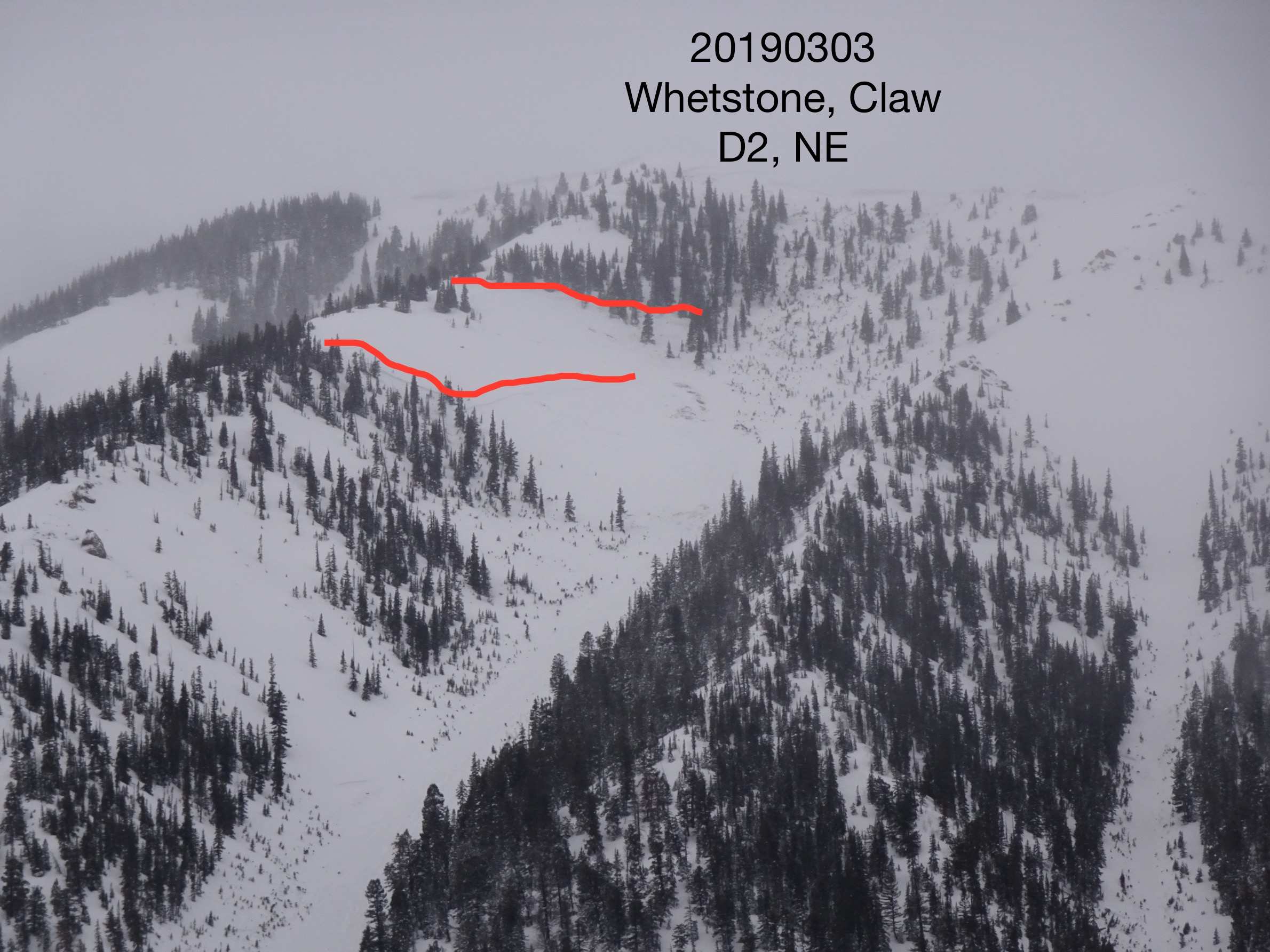 During this 3 day period. No avalanches where observed BTL in the Kebler, CB Town, and Washington Cultch areas (not all slopes viewed of course). While the weather was clear on the morning of 3/4, a very large crown could be seen on the Spork of Mt Gothic (observed in other observations). A large avalanche within the new snow was observed above treeline on a south aspect of Mt Baldy. Poor visibility of something on a southerly ATL slope of the White Massive, and poor visibility of something on a NE aspect NTL in the Skyukill area, all failing during 3/3 loading.