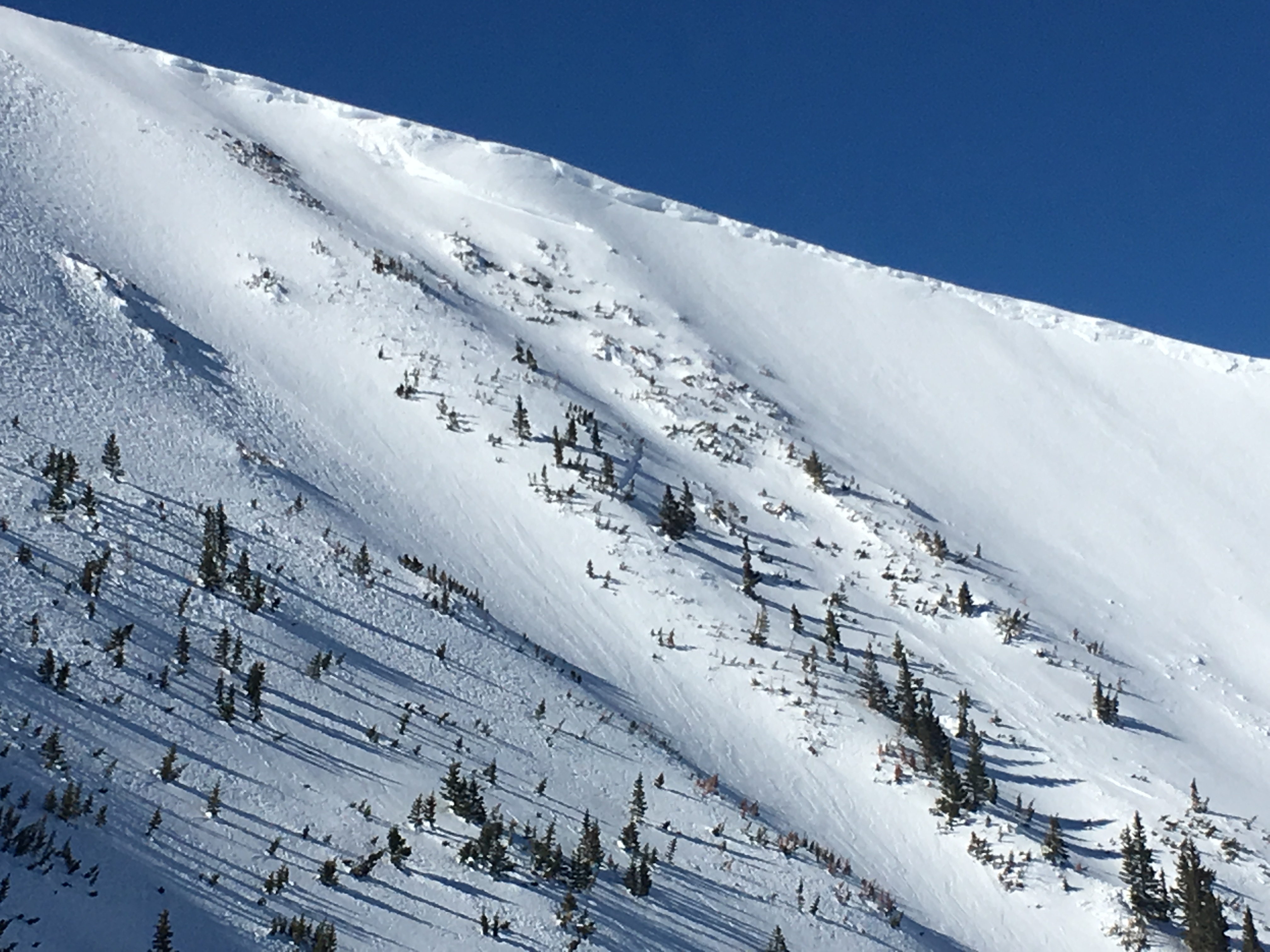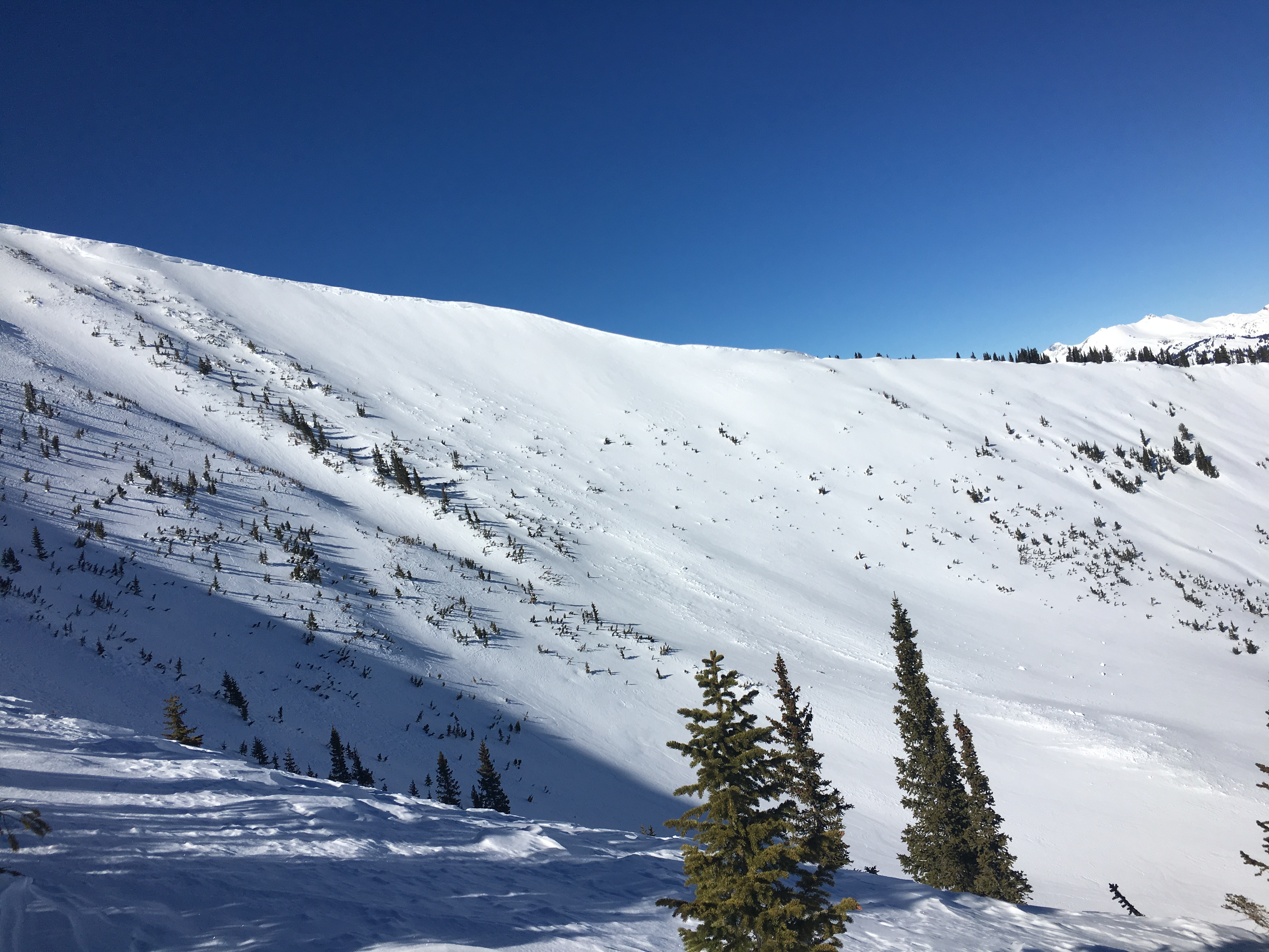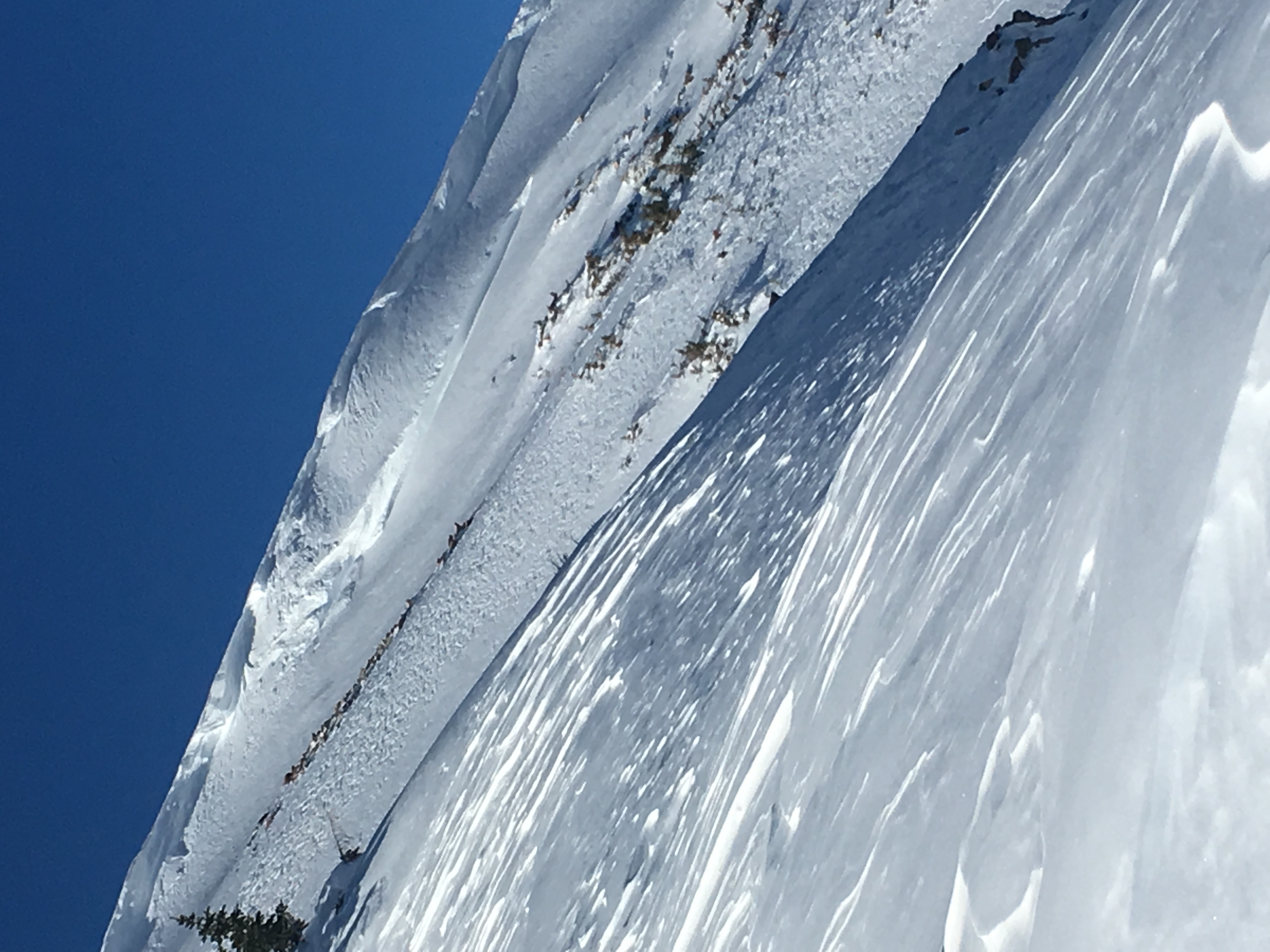 Snowpack: Less than 3 inches of new snow. Cornices between 1 and 2 feet guard 60% of the bowls. 3 inch wind slabs had already formed on the ridge and winds filled in skin track on the ridge between our 2 laps. 5-15 feet shooting cracks on the 1-foot cornice on top of convex corner.