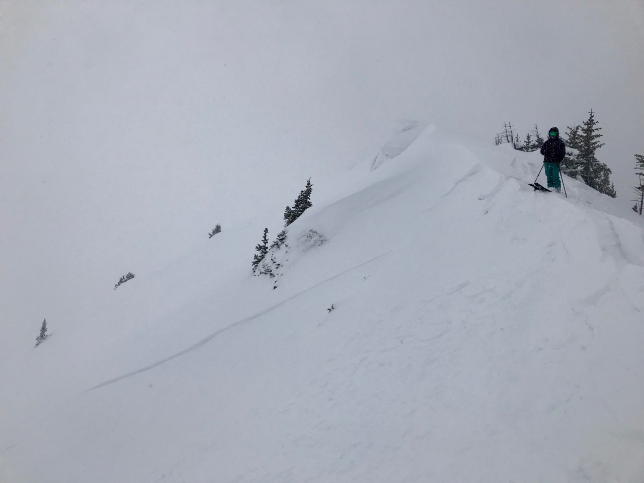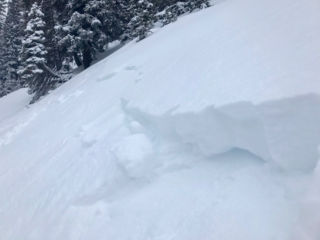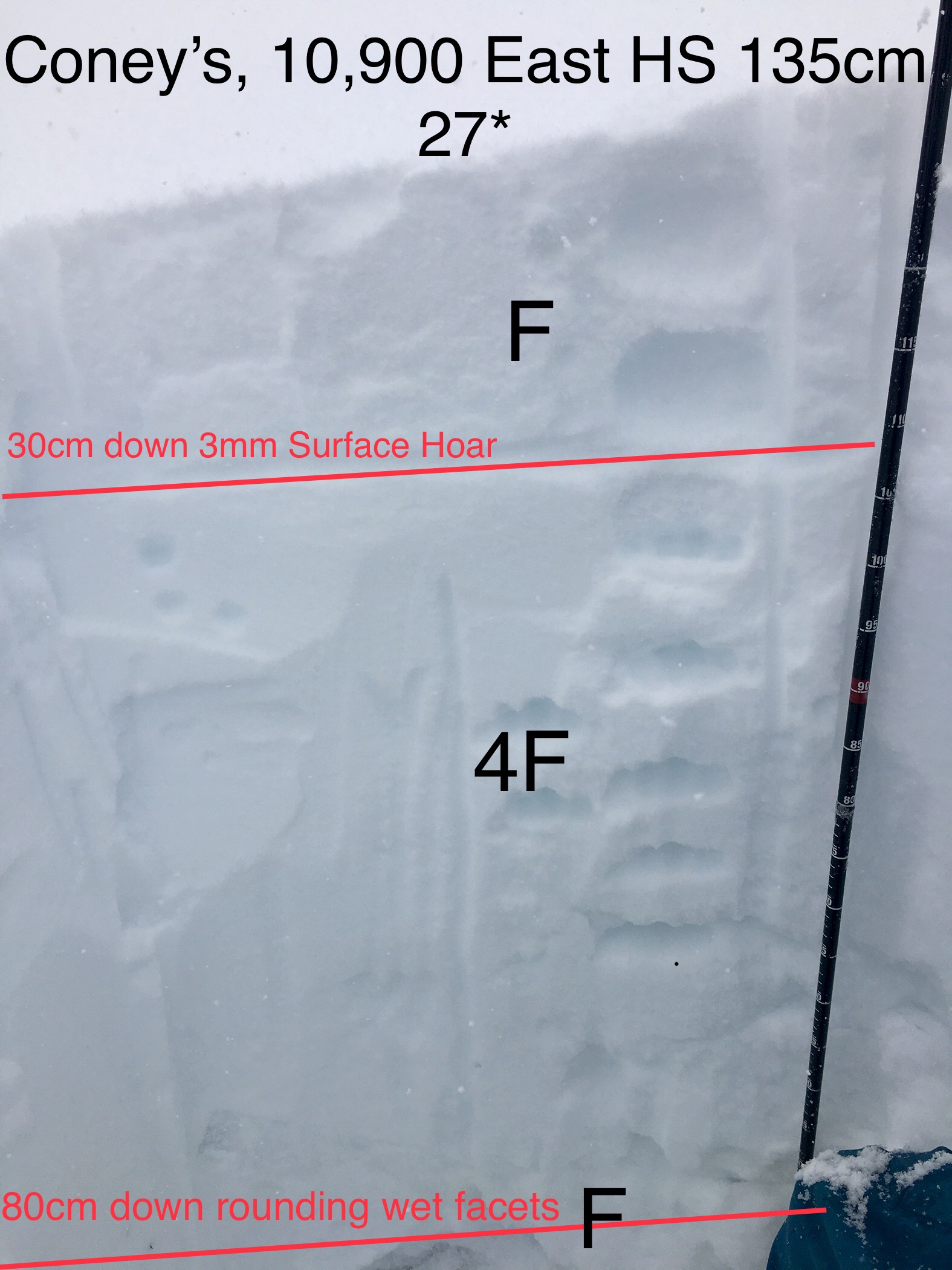 Snowpack: By and large the snowpack was not supportive to Rando skis until just below 10000 feet, and then it was supportive only intermittently. Experienced one large collapse at just over 10000′. Could not see any shooting cracks but collapse was large and loud enough to startle me. Only other collapses of the day were at lower elevations. These were much smaller feeling and did not seem to propagate more than a few inches past my ski tips. Dug a pit at 10200′ on NNW aspect BTL. Snow depth 100cm. Upper 20cm was new storm snow. Below that was soft “slab” 4-finger to fist hardness, softening with depth. At ~40cm above ground level it became coarse grained sugar from there on down. Compression test produced failure @ 20 cm below snow surface after 8 taps from the wrist. Failed again at about 50 cm below snow surface after 5 taps from the elbow, though second failure did not really sheer on any kind of bed surface. It was more like the “slab” just sort of crumbled.