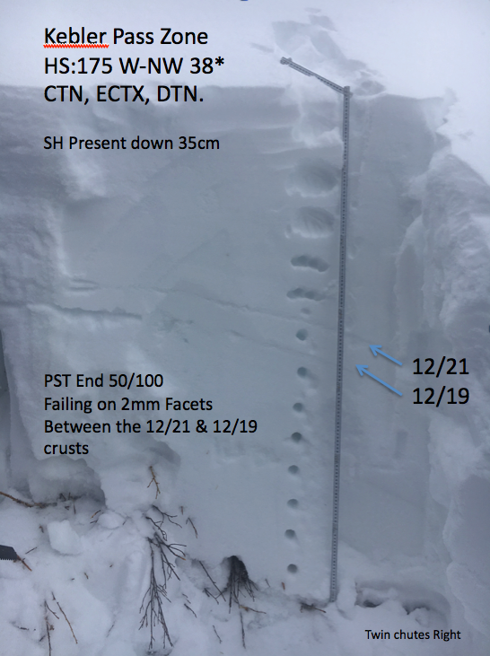 Snowpack: Today we observed excellent ski conditions. Throughout ascent, we observed new years snow softly laid over the terrain. As we traveled up in elevations near the Coon Summit and Red lady summit, isolated pockets of wind slab were observed. Slabs ranging from 2-6″ thick and reactive under foot and hand shear tests. One small shooting crack observed within new wind transported snow at the top of coon summit. Red lady bowl entrance showed signs of wind slab in the upper upper start zone near the small cornices. Careful Route finding was pertinent today. Persistent Slab Structure Present on these SE-SW aspects in upper elevations.