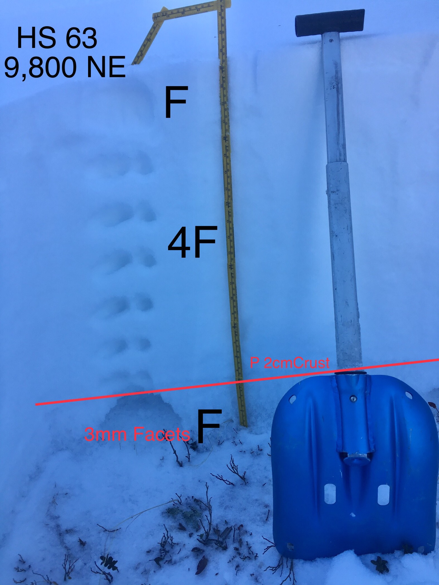 Surface conditions are a mixed bag and will be interesting in the future. South slopes had multiple sunbursts in places, while SW had a crust on top and a softer crust just below. All these crusts had small facets above and below. 2mm Surface hoar and 1mm Surface Facets were noted on all aspects and elevations traveled, though the sun and light winds were taking a toll on them.