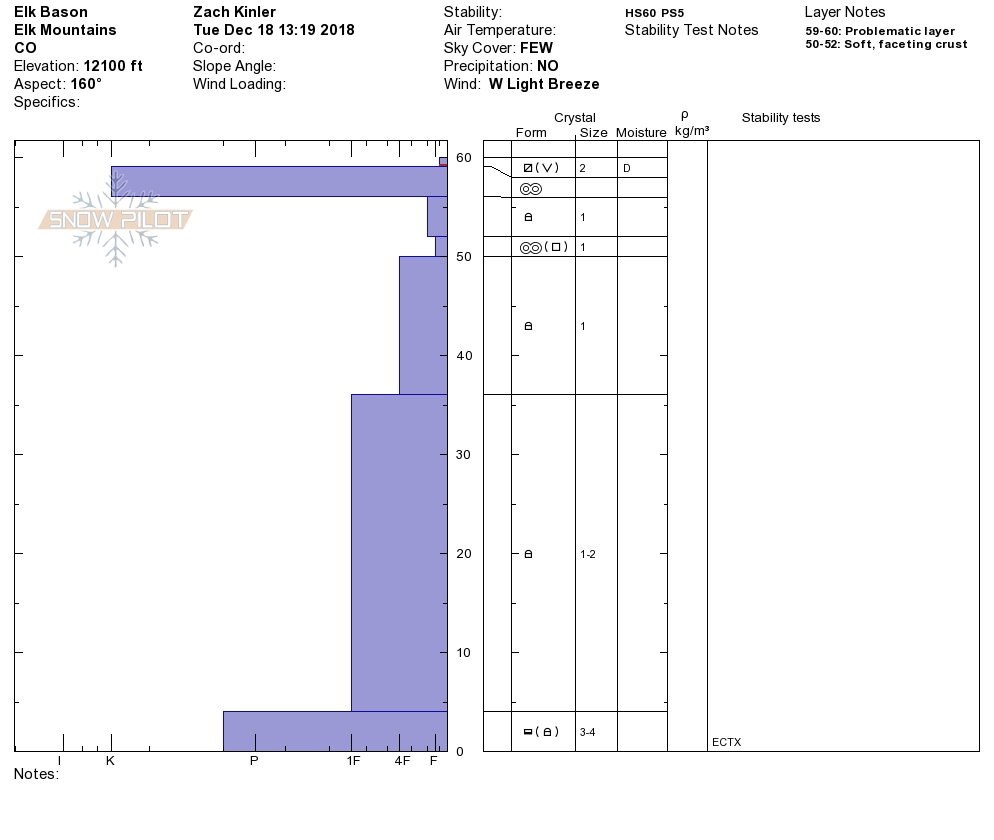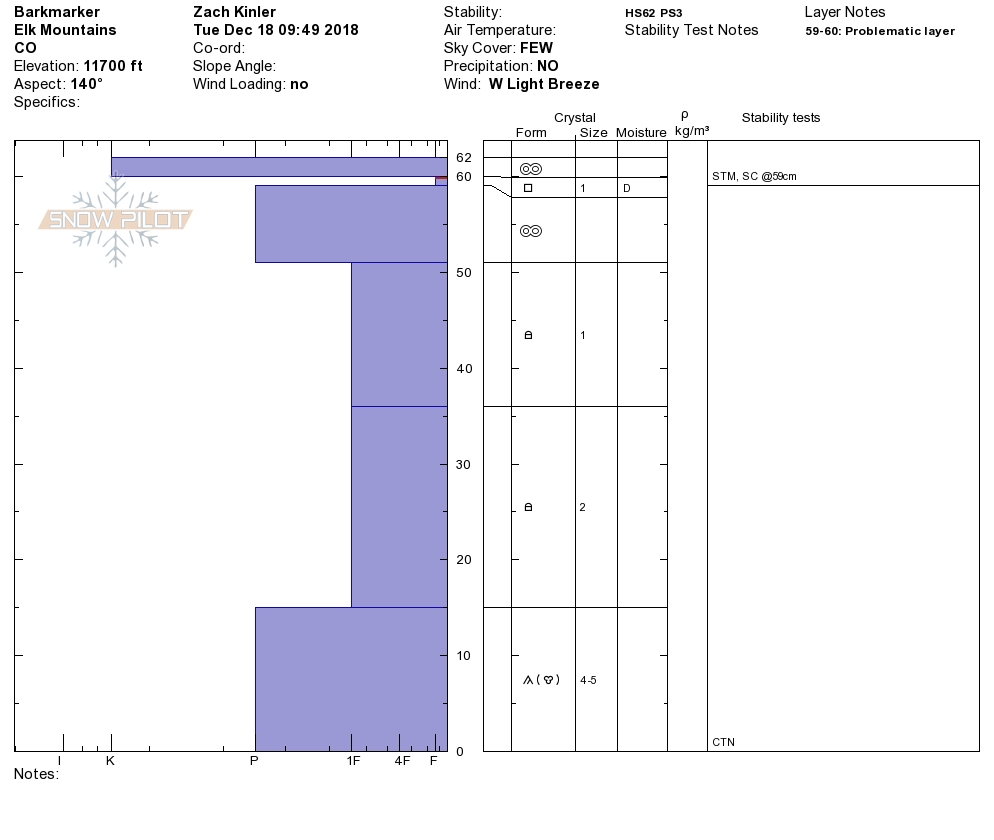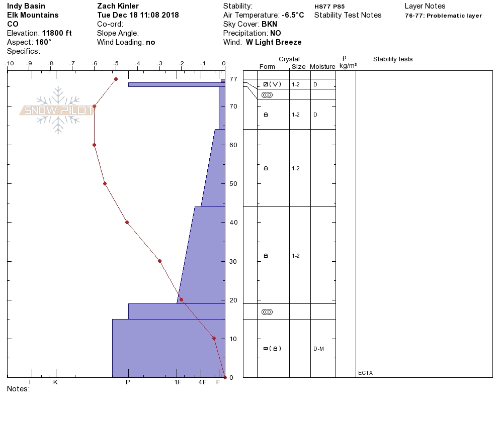 Snowpack: We went looking for Persistent Slab structure today and had a harder time finding it on Southerly slopes. Where we did find it it was unreactive to our snowpack tests. Southeast and South facing slopes had a noticeable lack of weak snow at the ground, while Southwest to West slopes still showed this PS structure to some degree. Overall HS ranged from 110 to 70 cms with areas above treeline being in the 20 to 60 cm range.