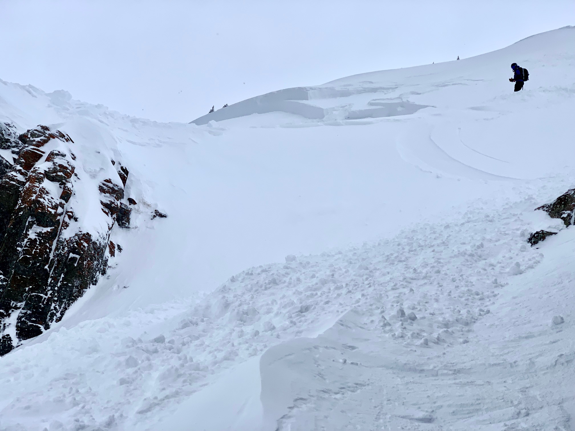 A few below treeline slides on northerly aspects – two were small storm slabs in small repeater paths from January cycle. Two others were large in size and looked to have failed deeper in the snowpack. Two near treeline slides on Cement Mountains north side on drifted features- one D2 and another D2.5 which may have trimmed a few trees. Did not get good views into alpine terrain at the head of the valley.