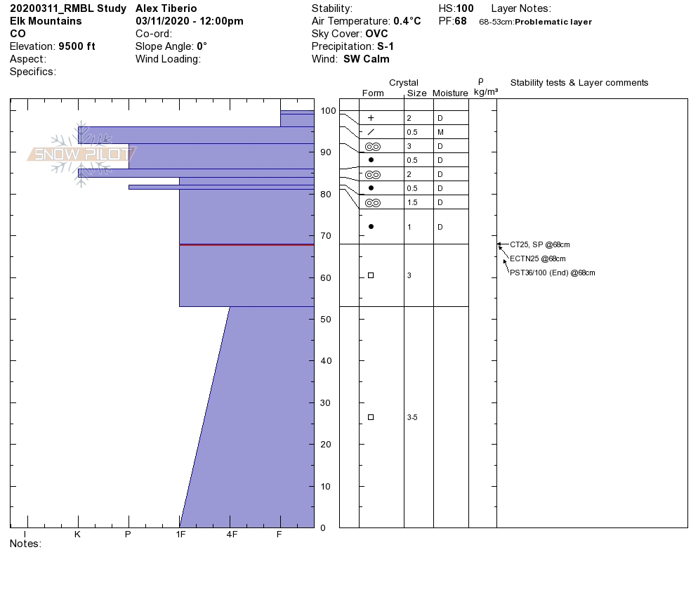 Weather: Low level fog/clouds over the upper Crested Butte Valley in the AM hours. Mostly cloudy sky above with the sun shining through a few holes. Light winds at ridgeline. S-1 precipitation at times with no notable accumulation. Light misting and rain around sunset in CB. That rain didn’t appear to add much measurable water. While watching outdoor furniture, chairs became wet, but never started dripping #science.