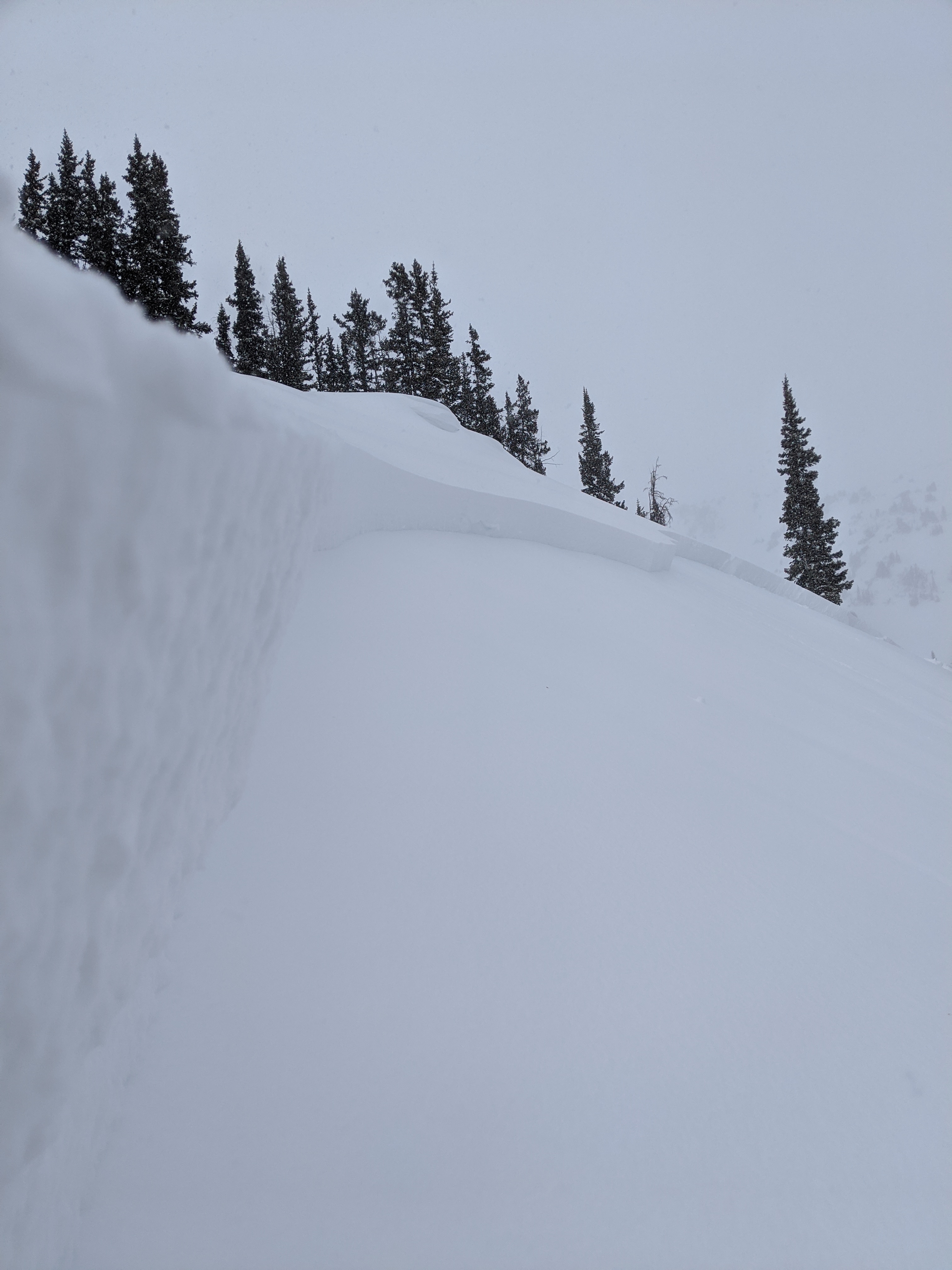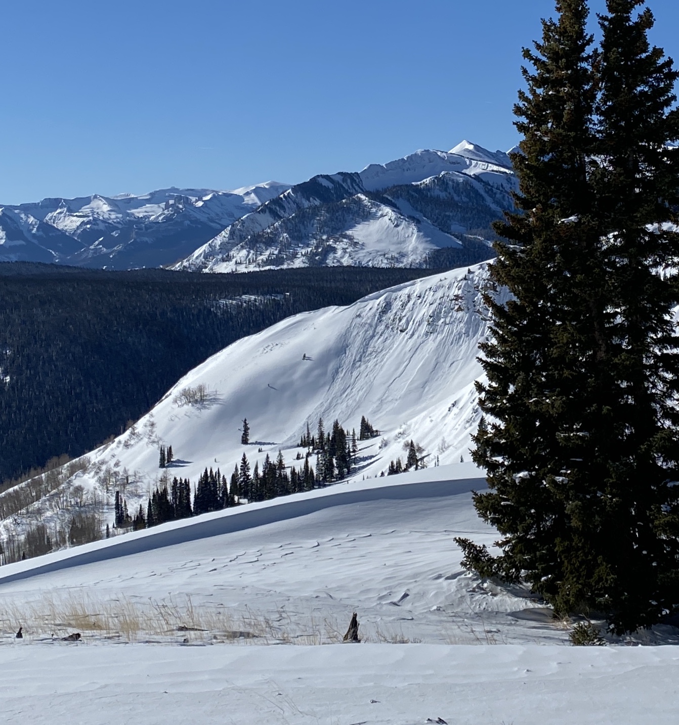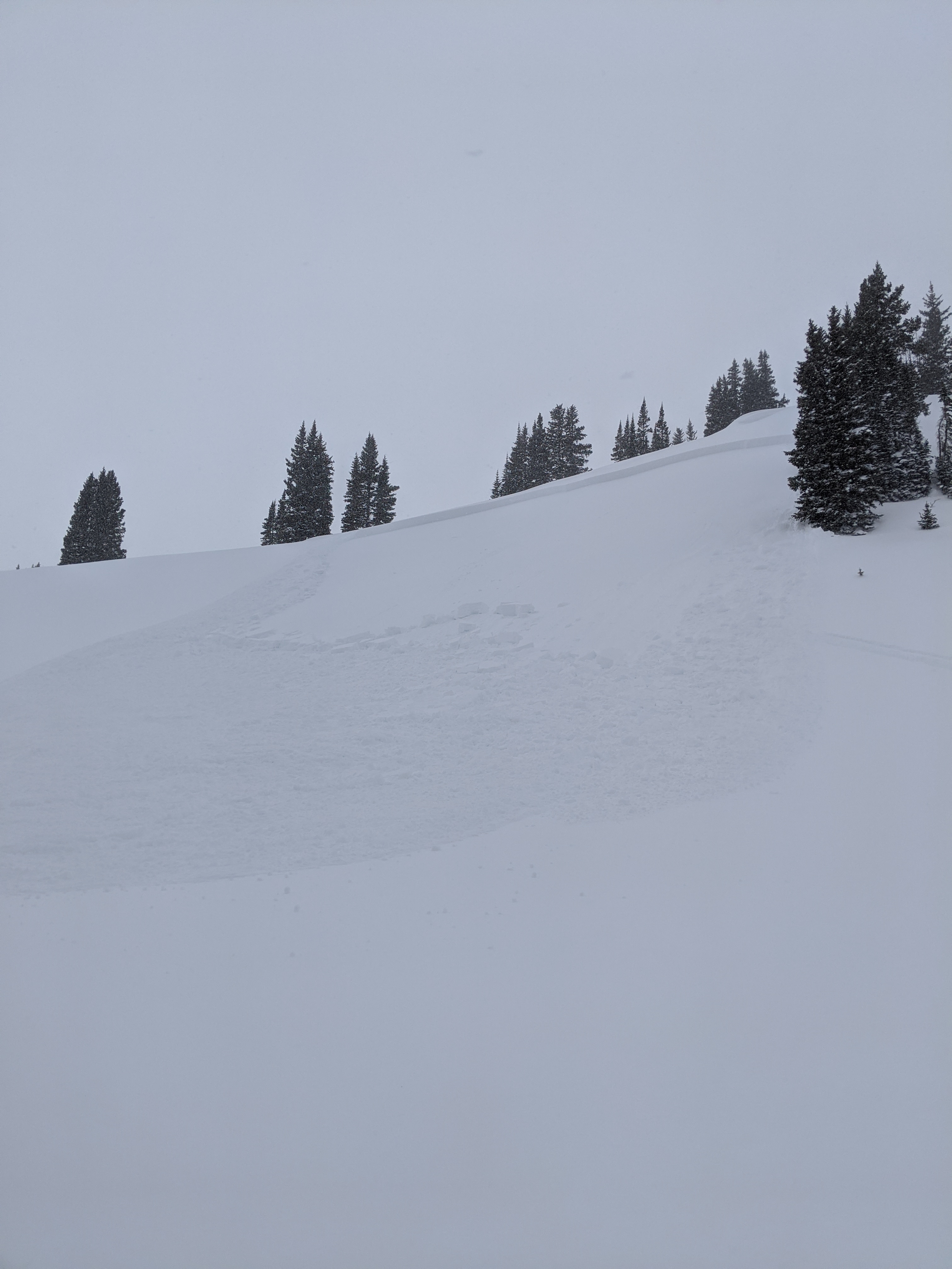 Estimated Snow Bike triggered avalanche from low on the slope. ESE aspect, 11,100ft elevation. Estimated 80-100cm crown. Interesting that the crown wasn’t higher on the slope or that it didn’t propagate wider. Maybe SH pocket as this is somewhat low in Robinson Basin and protected from some wind.