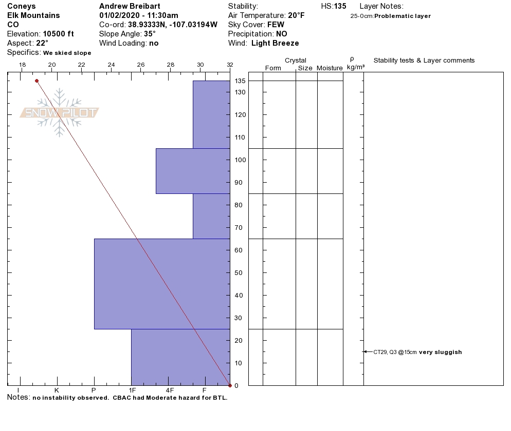 Poked a quick hole around 11k on a northeast-facing slope found an HS of 120cm; I believe this slope may have avalanched very early in the season as it appeared to be slightly shallower and weaker than expected. Performed ECT to test the facet layer that was buried at Christmas, but even with 40cm of settled snow above the interface(still mostly F hard with small bit of 4f) a slab has yet to form, ECTN 12 result. Quick shovel tilt test revealed interface beneath the New Years storm; this interface is only 12cm below the surface at this location as winds have stripped some volume in the past two days. Tested the 3mm to 4mm basal depth hoar with a Deep Tap test, DTM.