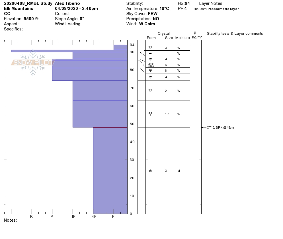 On southeast slope at 11,500′ found HS around 150cm with water pooling at the first crust about 40cm down, ECTP 26 beneath the crust with water pooling and above a second crust just a few inches deeper. Another prominent crust was present 50cm above ground with weak, moist 4f snow at the ground. Did not find any ice lens’ lower in profile. Snowpack structure appeared to fit with observed Wet Slab avalanche activity on similar aspects in Rustlers Gulch from the past couple of days.