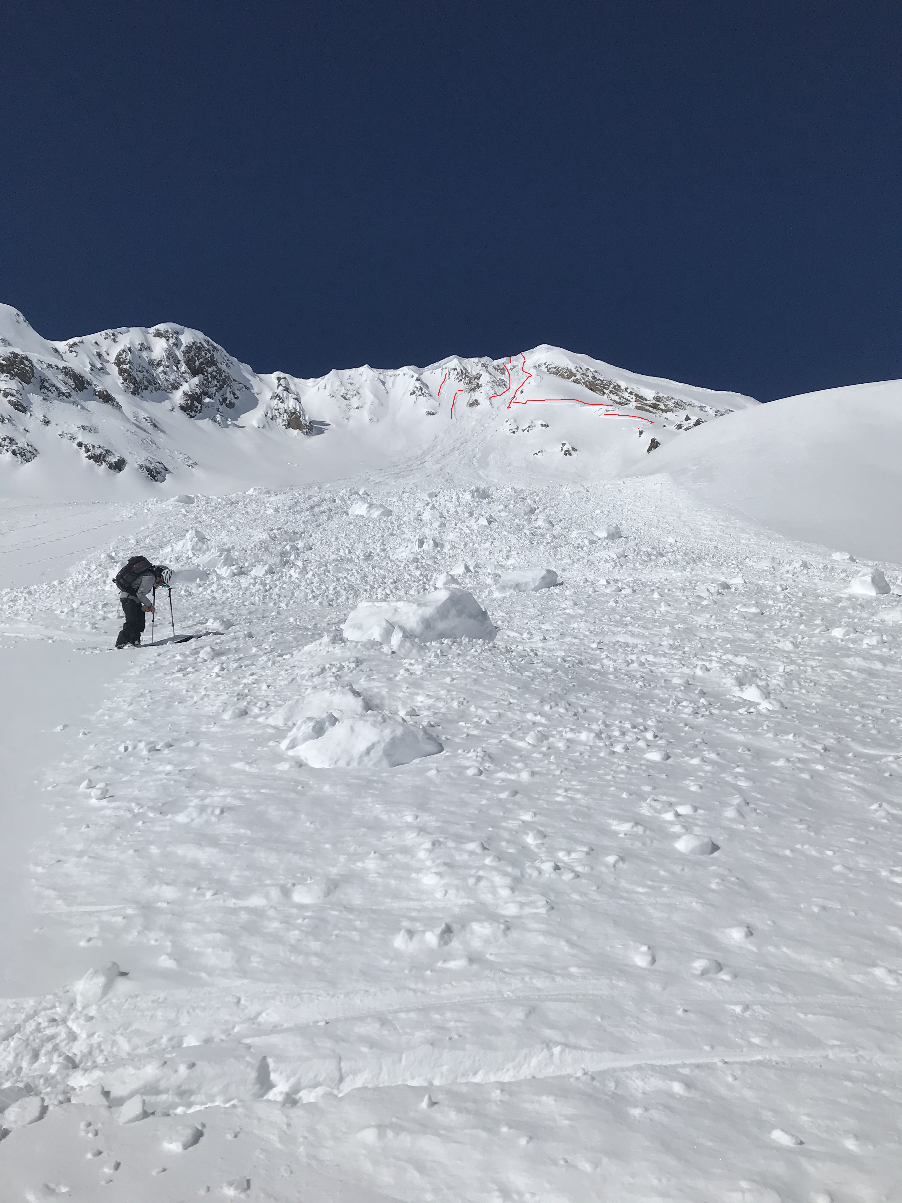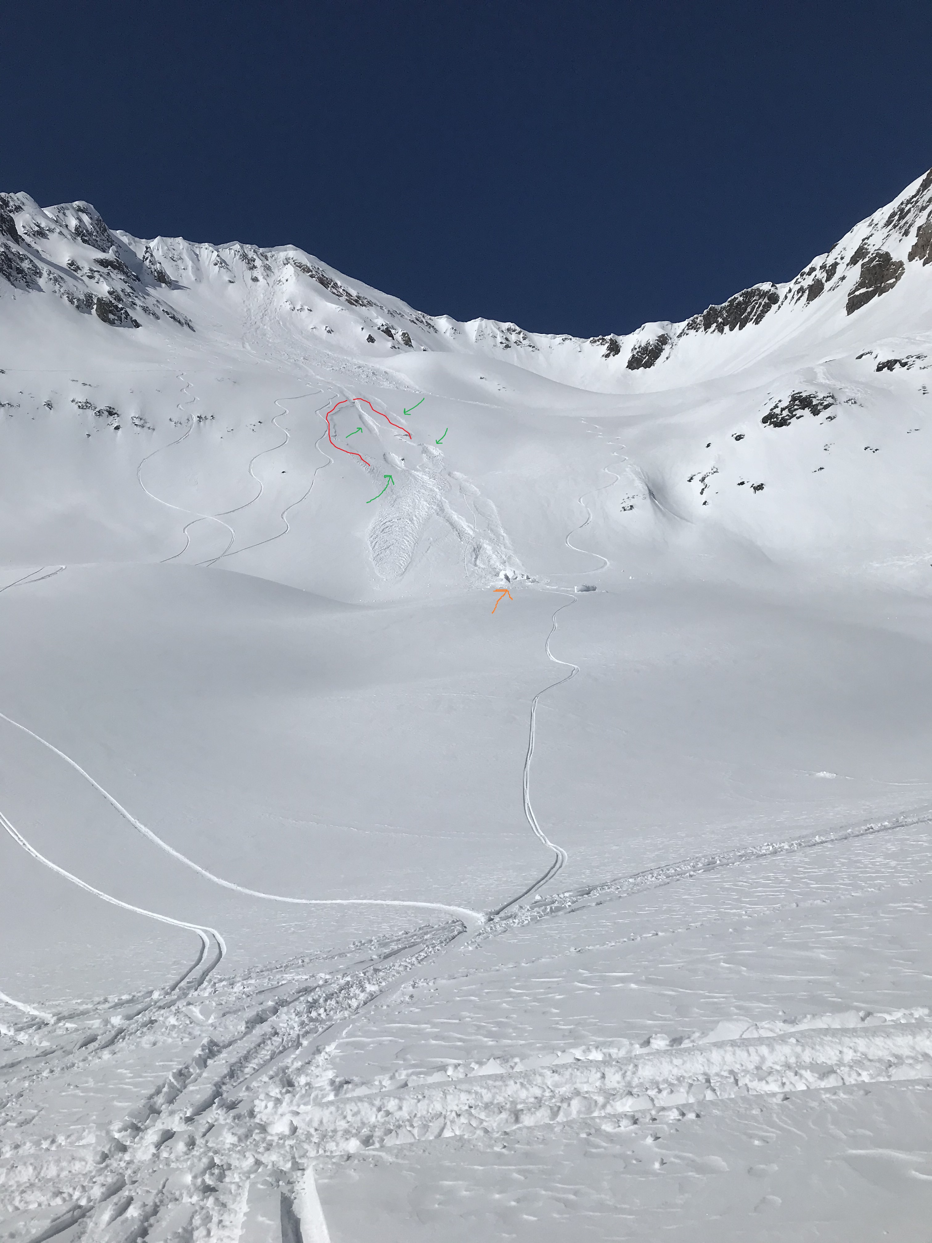 Avalanches: Large cornice fall (estimated) late yesterday triggered widely propagating slab in recent storm snow. R2D2.5 The spx in the E facing gut off Owen was basically destroyed from the massive blocks running through. First photo from toe of debris pile shows the multiple smaller storm slabs that released as a result of the massive impact from the cornice failure. Second photo from the bench below Scarps Ridge shows the lower storm slab released by the huge chunks bouncing (bounce impressions indicated in green) past the end of the debris pile, over the next roll and onto the bench (blocks indicated in orange). The last photo, with sled for reference, shows how large these pieces were (these are the blocks indicated in orange in previous photo). The three remaining chunks that hadn’t been destroyed over their 1500 vertical foot journey downhill were still about the size of small sedans.