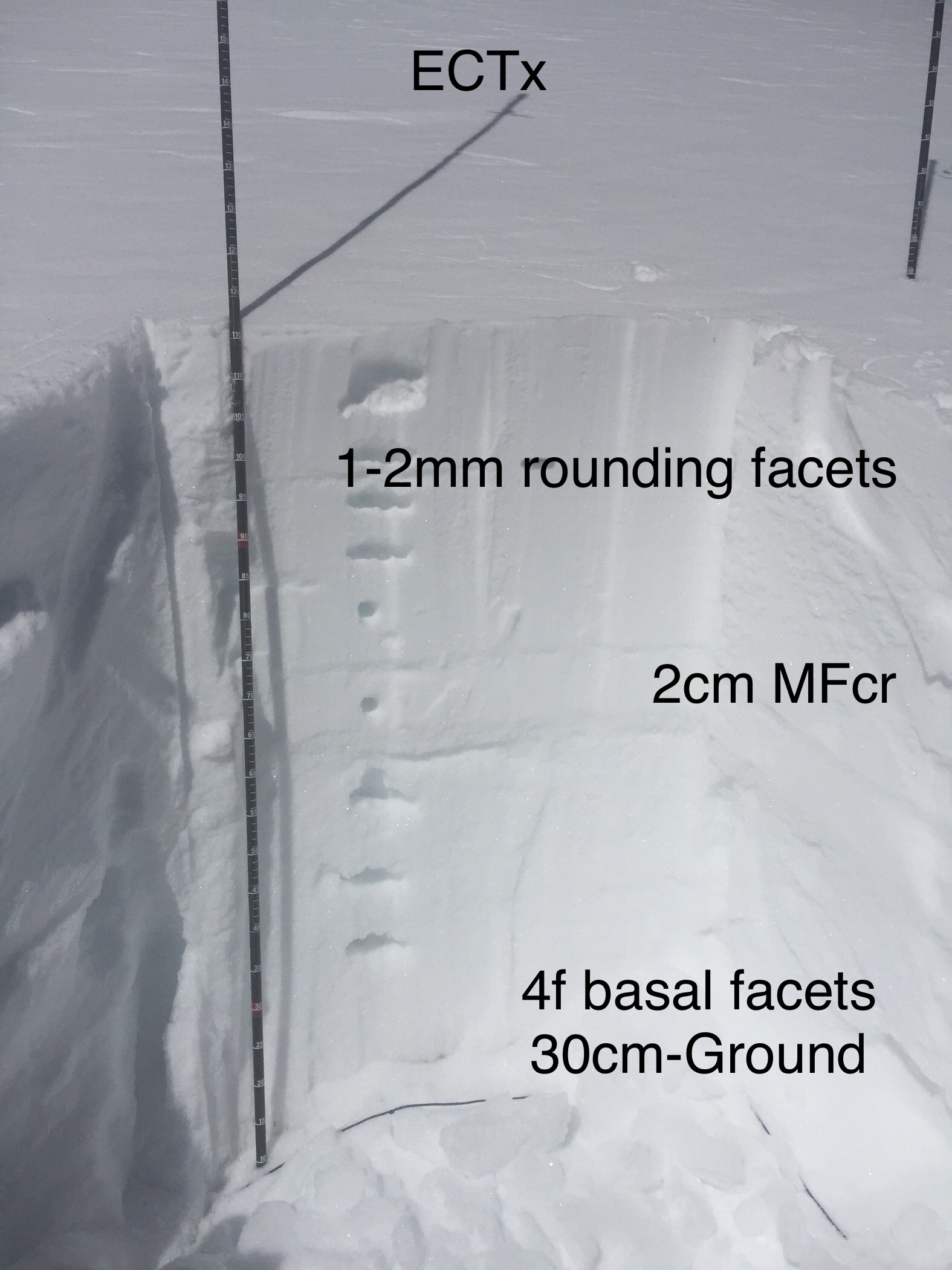 Snowpack: HS : 117cm. Persistent slab structure is present but not reactive in snowpack tests. The E-SE at treeline snowpack on the Gothic shoulder is harboring only a few melt-freeze crusts and a strong midpack. True east surface conditions stayed dry throughout the day with anything with more of a southerly tilt becoming moist by 1200.