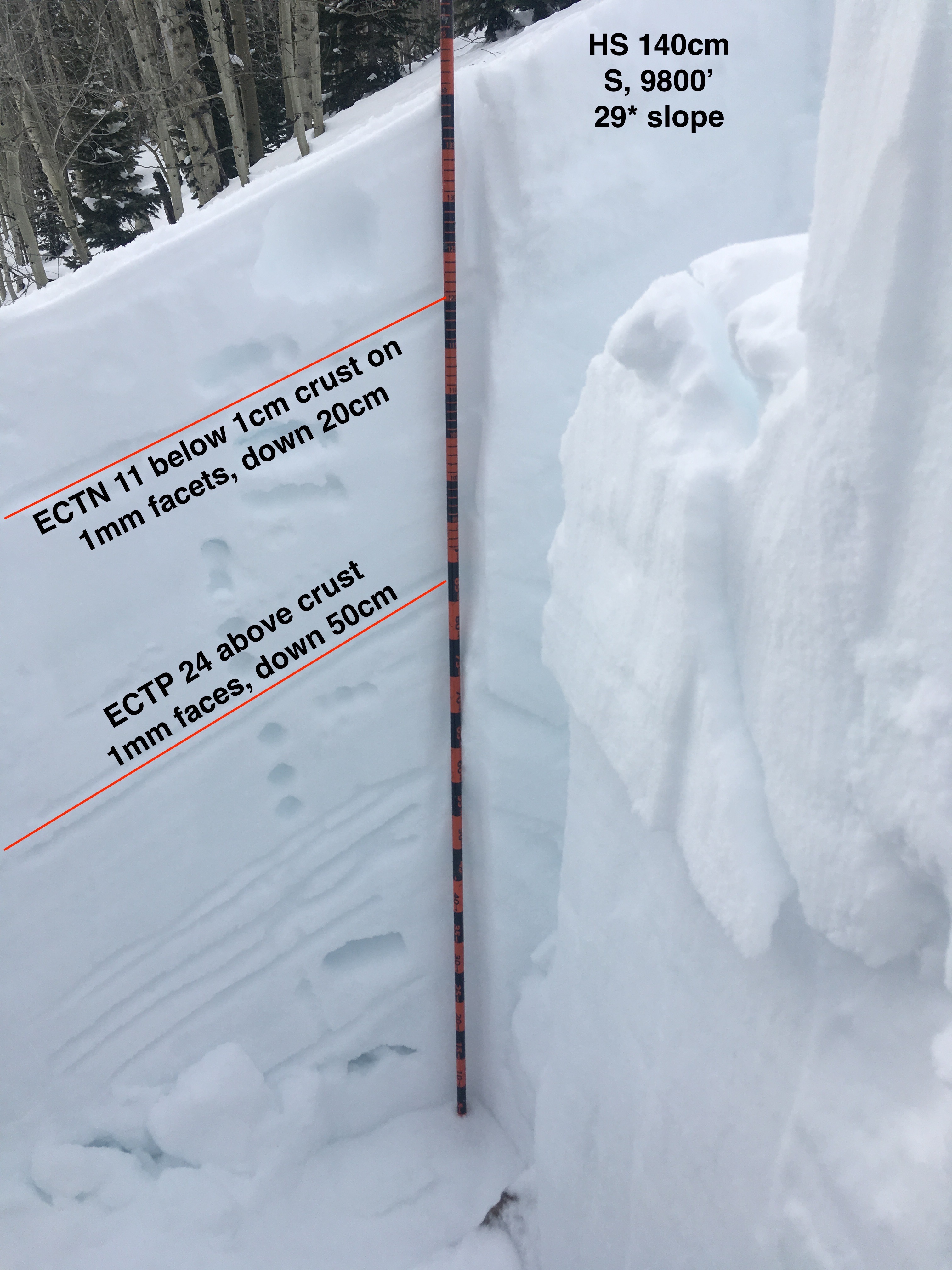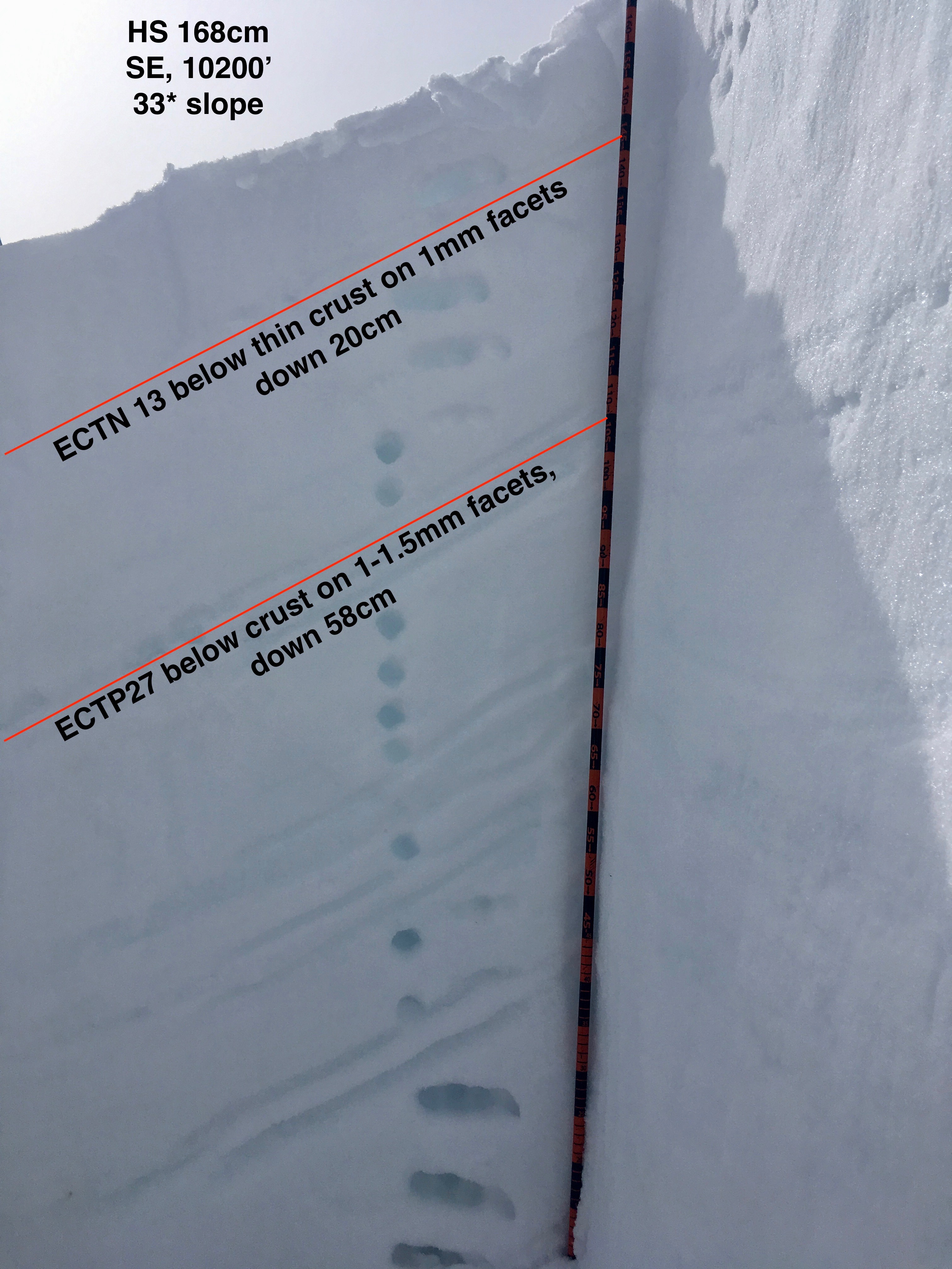 Snowpack: Poked a number of holes in S and SE slopes between 9500′ and 10,800′. HS ranged from 140cm to 175cm. All surfaces from SE-S-SW became moist today and were refreezing in the afternoon – surface crust ~1 cm thick. Two crusts of concern in the upper snowpack – the upper was generally thin ~1cm with on average 20cm F to 4f slab resting above. The lower crust was ~2.5cm thick with 40-65cm slab resting above. Facets below the second crust were up to 1.5mm in size. Upper crust produced ECTN results at all sites. Lower crust consistently produced ECTPH results below the crust, but locations with shallower HS failed above the crust.
