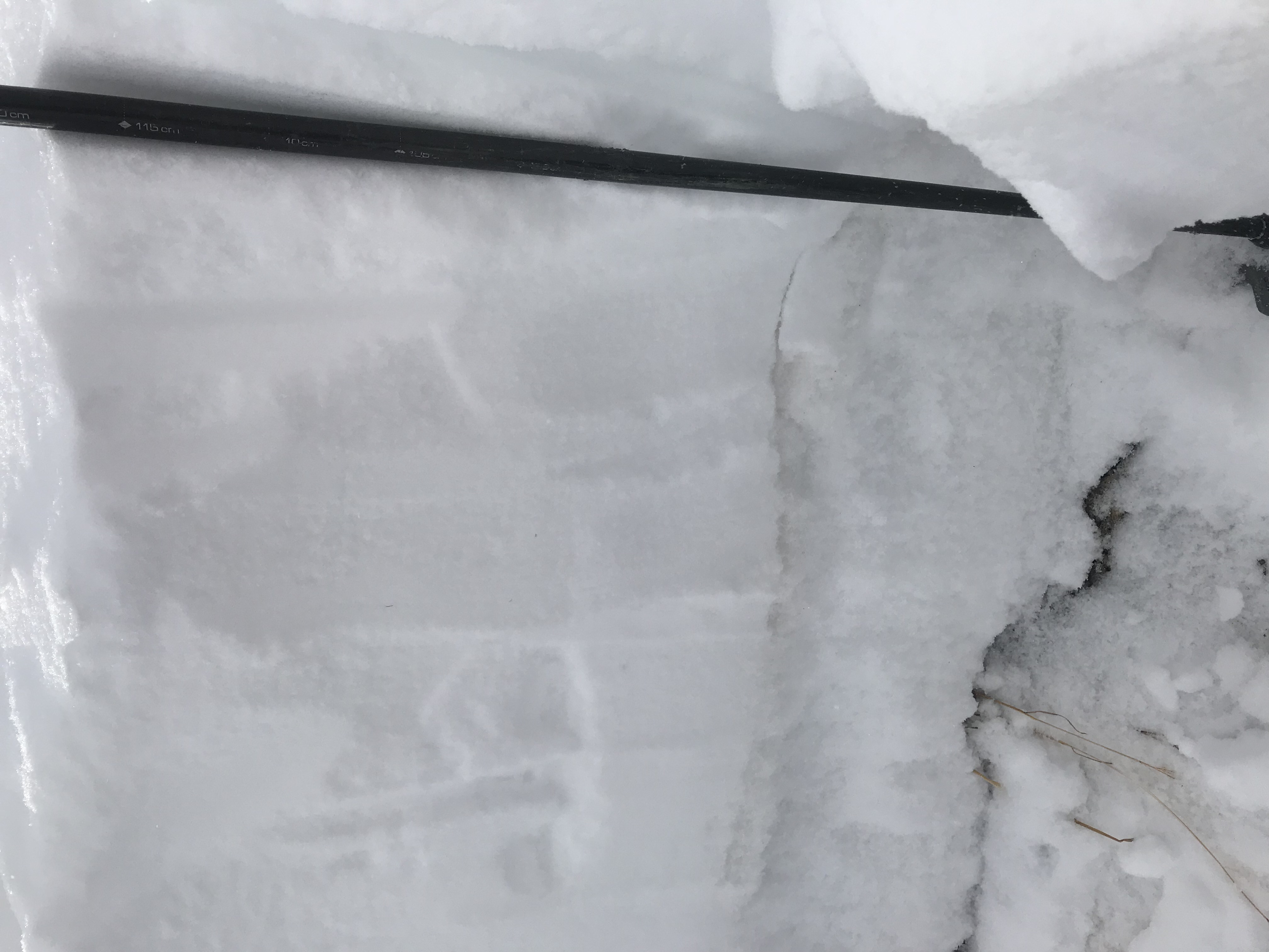 Snowpack: Toured up Poverty Gulch to an easterly face at about 11800′. As we were skinning up the last of the climb, a large crack set off, it was about 100 ft long and produced a loud “cosmic” sound. Unfortunately, I did not get a chance to see how deep it propagated. We did not experience any other cracking, collapses, or any other avalanche obs during our tour. After a investigatory pit we found that the total snow-pack is about 115cm. I did a small column test that produced a sudden collapse with moderate taps below the sun/dust crust as well as a shovel sheer test that failed with moderate pressure just above the sun/dust crust.