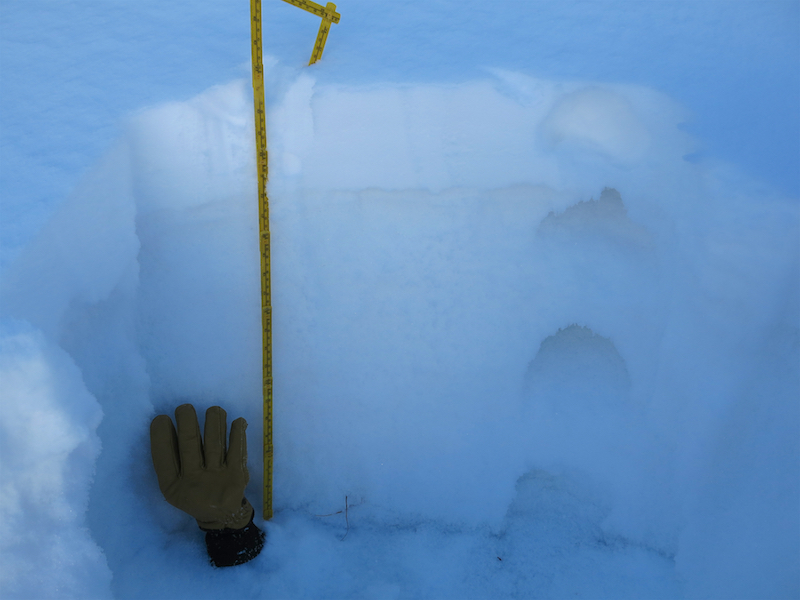 Protected NNE facing slope at 10,800ft. The new snow may look more white, but it was still just sugar on sugar. When ever that new snow forms a slab it will be ugly, but it hasn’t happened yet.