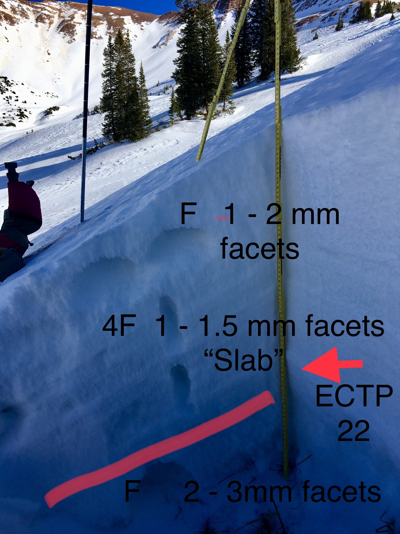 Dug one quick profile on an due North slope at 11,250 which had seen previous loading(HS 78cm), and found a cohesive slab resting over the Oct/early Nov snow. This site produced a hard propagating test result in an ECT (ECTP 21). This site had deeper snowpack than the immediate adjacent terrain, but shows the potential for isolated areas with deeper accumulations from loading to have a slab/weak layer present. See photo.