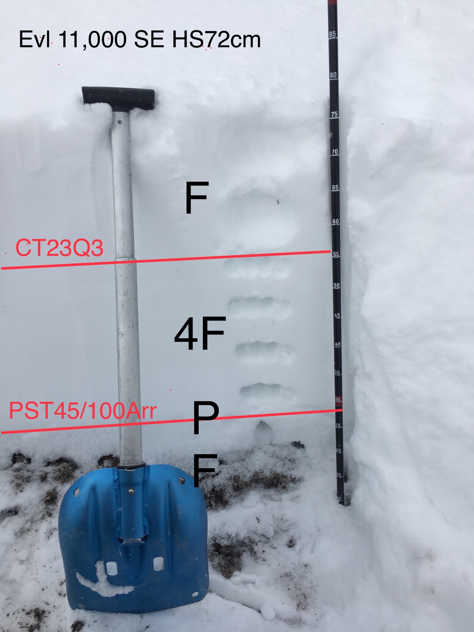 Snowpack: HS ranged from 30cm to 80cm through out this area. The new storm snow has settled significantly. There where two concerning interfaces, a pencil hard crust with 2mm facets 15cm from the ground. And at 54 cm from the ground a 1-2mm facet interface F over 4F.