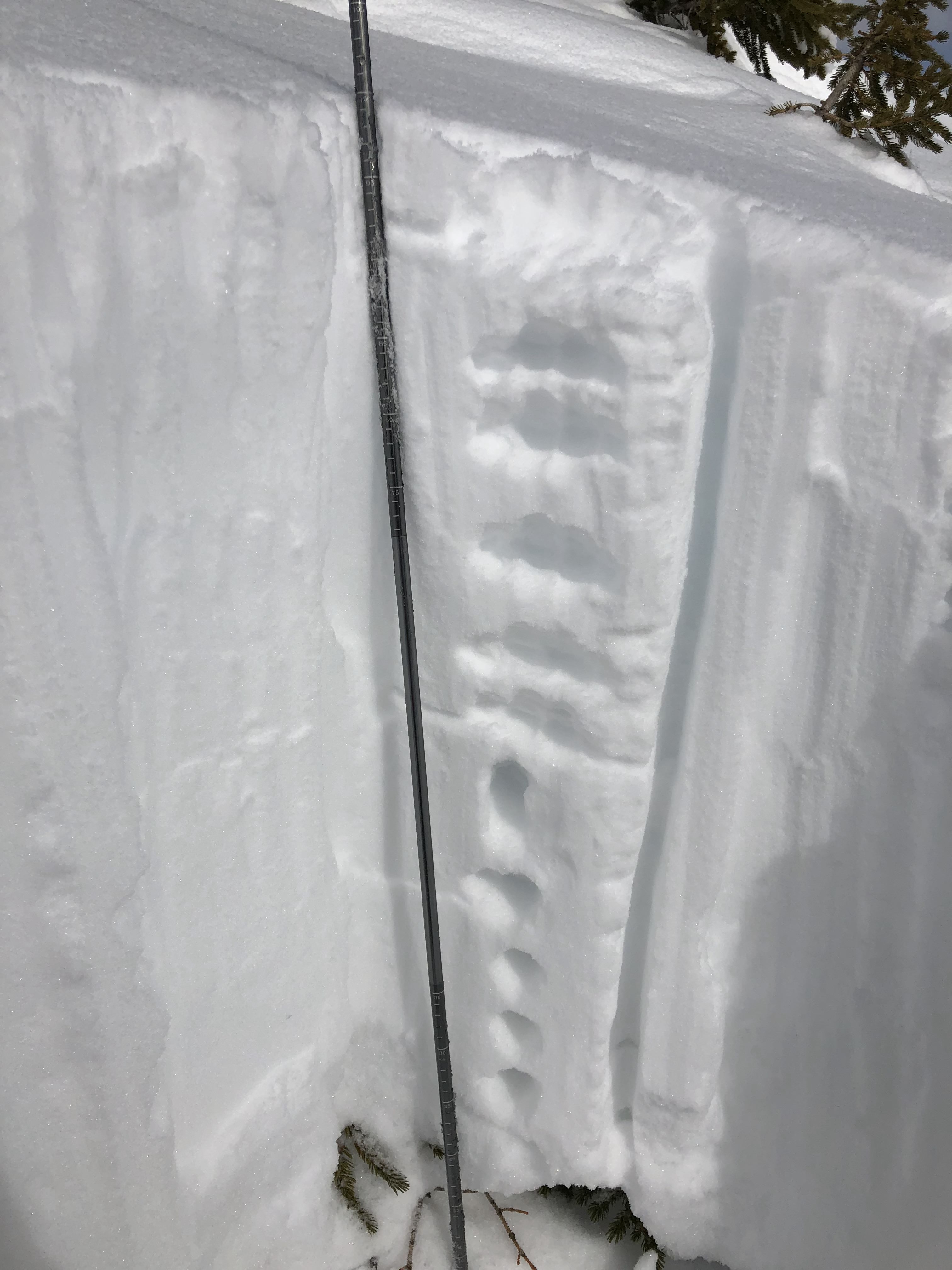 Snowpack: One meter deep near tree line on a south facing aspect. A column test fractured the layer (about 5 inches down) between recent snow and the older, more consolidated layer on the seventh tap from the elbow. Nothing in the column fractured after that. There was a hard, defined icy layer in-between the ground facets and the bottom most consolidated layer of snow. Lower below treeline the new snow had turned into a, challenging to ski, breaker-crust. Our party of four observed no collapses or shooting cracks, and we kept our slope angle under 30 degrees.
