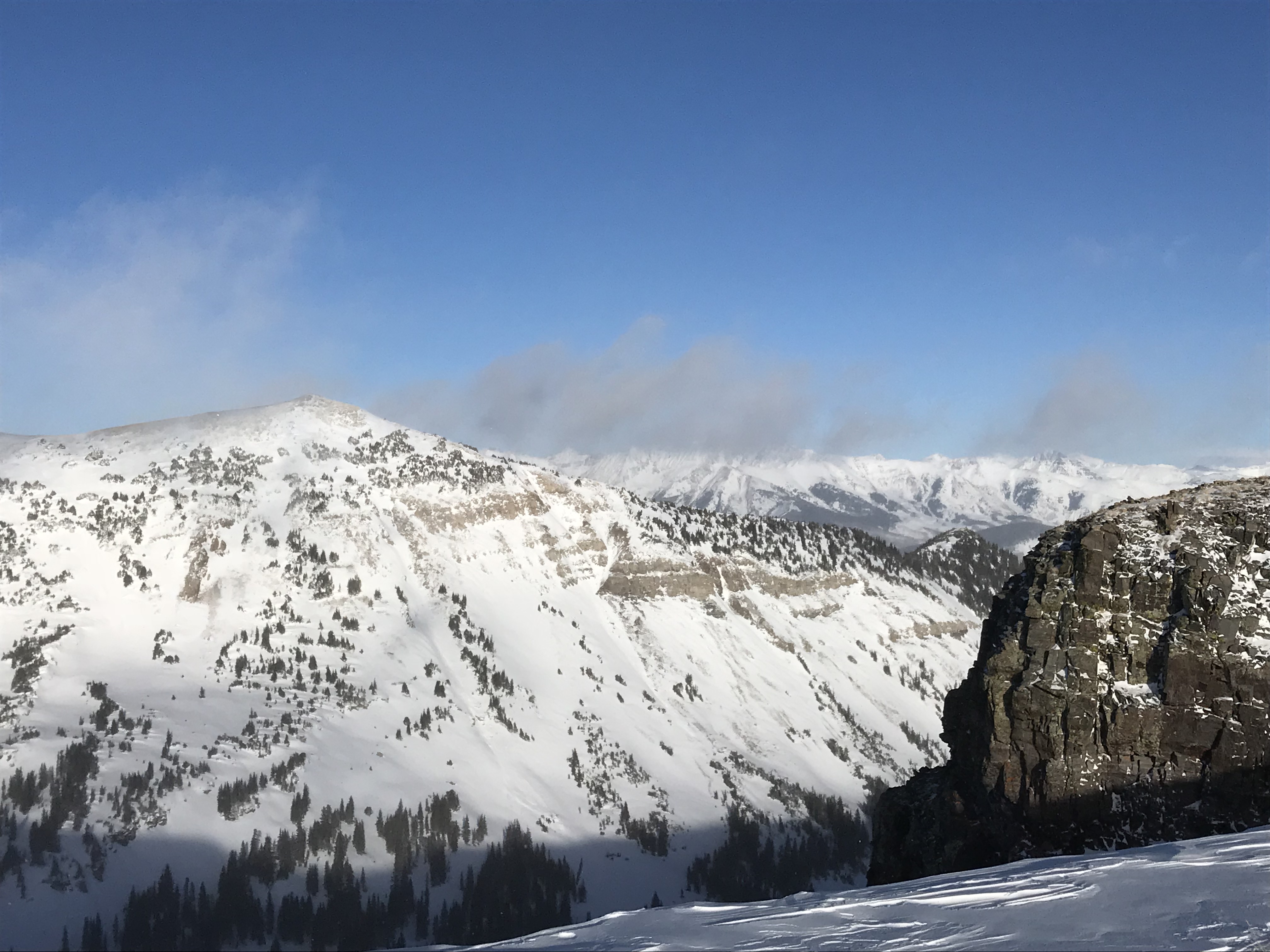 Weather: Partly cloudy with residual clouds hanging and obscuring Ruby Range and high peaks across Elk Mountains. Clouds increased throughout afternoon under cold, NW flow, with light orographic snowfall accumulating to 1/4″ of very low density fluff. Winds remained blustery all day, at all elevations. Temperatures remained cold, with temperatures not climbing much out of the teens.