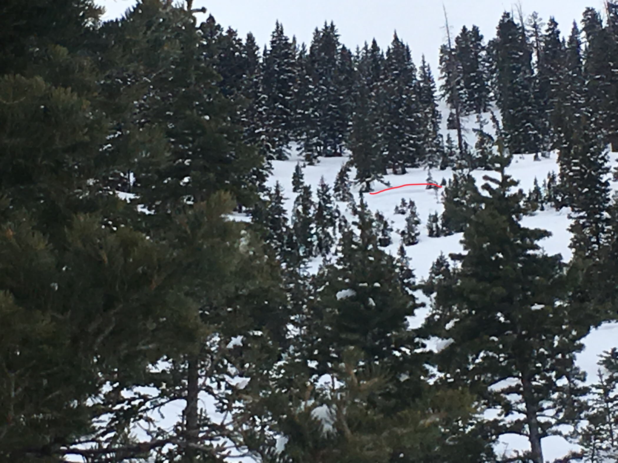We triggered on small slab mid track on this run. My line choice did not allow me to inspect crown but it was 14-18” deep and approx. 20 feet wide. It ran at most 50 vertical feet. Failed on small convexity. Some rocks were just visible in bed surface. My best guess was that this failed on an old bed surface based on old crown several hundred vertical feet above, but it’s depth also corresponds to 1/20 interface.