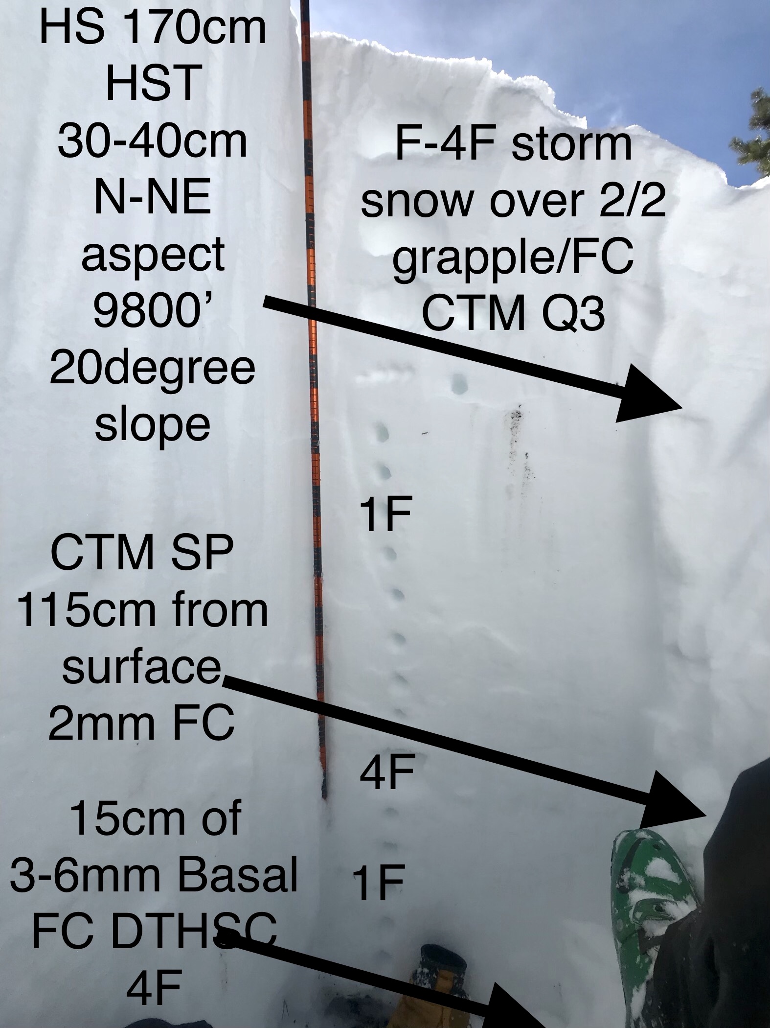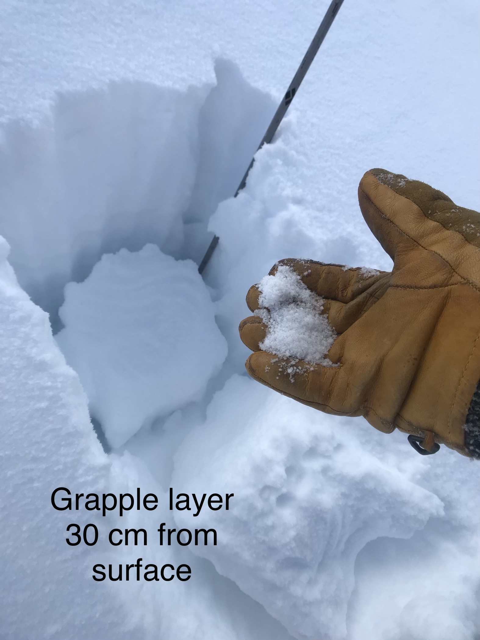 Graupel layer 30-40 cm from surface consistent from lower elevations on up to pit site at 9800′. CTM PC. Seems to be settling out. This layer is present all around the zone form 2/3 grapple event?