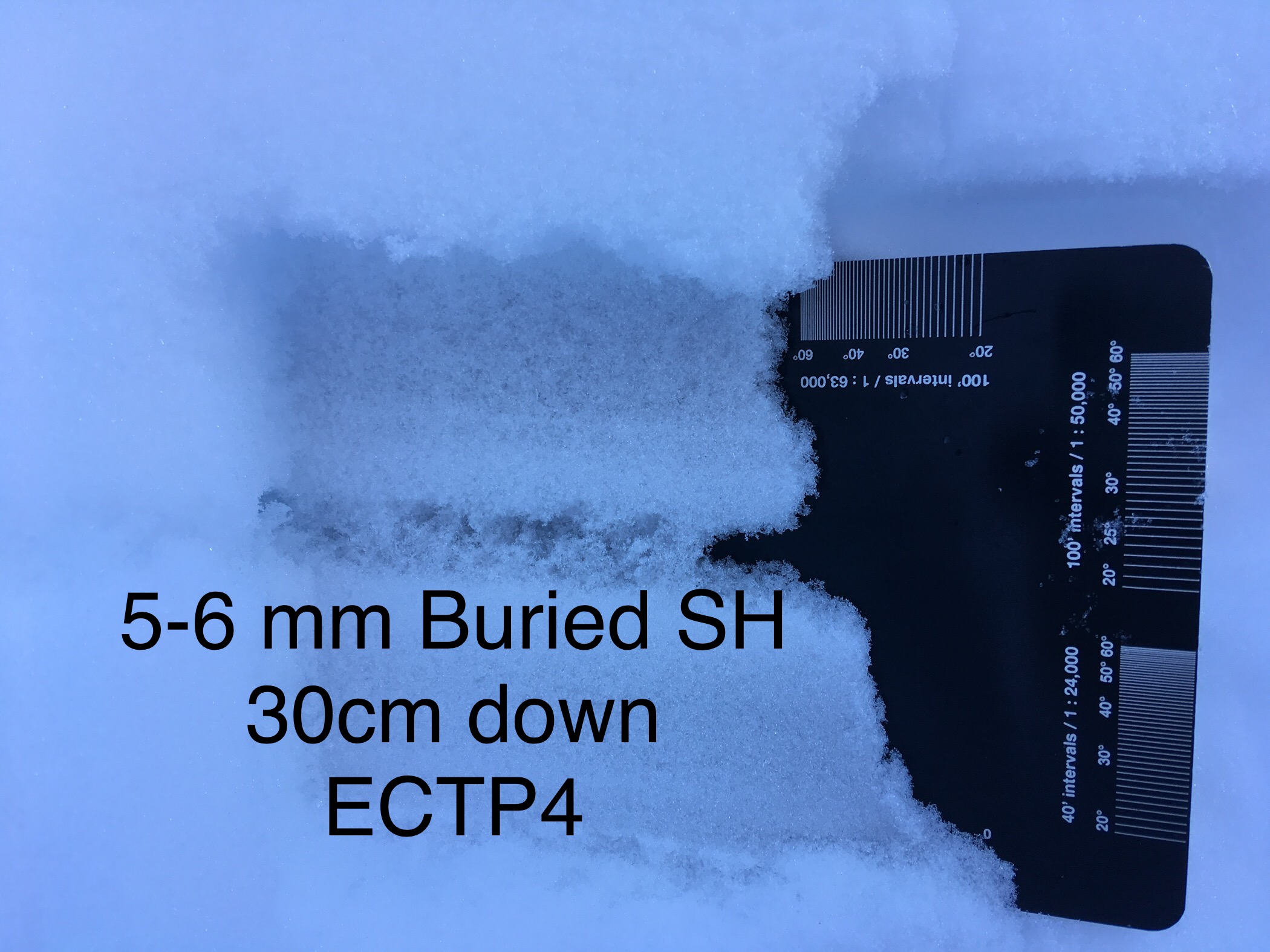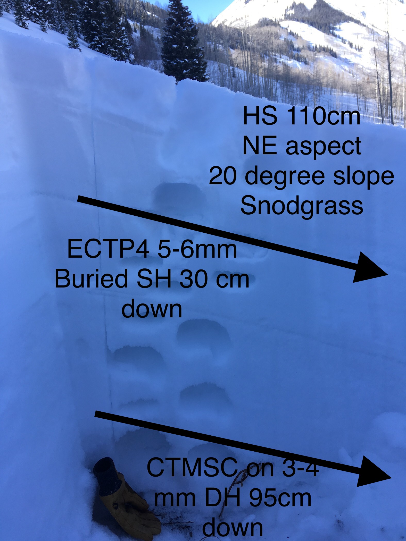 Snowpack: 100-120cm of snow observed. Persistent slab present present in multiple depths of the snowpack. Sudden results from CT’s on deeper layer of facets 2-3 mm, 95 cm down with 4F-F Slabs above. & one propagating result on a buried surface hoar layer of about 5-6 mm SH layer 30-40 cm from surface. F- 4F Soft Slab above this Buried SH. We tracked this SH layer throughout the terrain and seemed to be present from 9800’ – 9400’