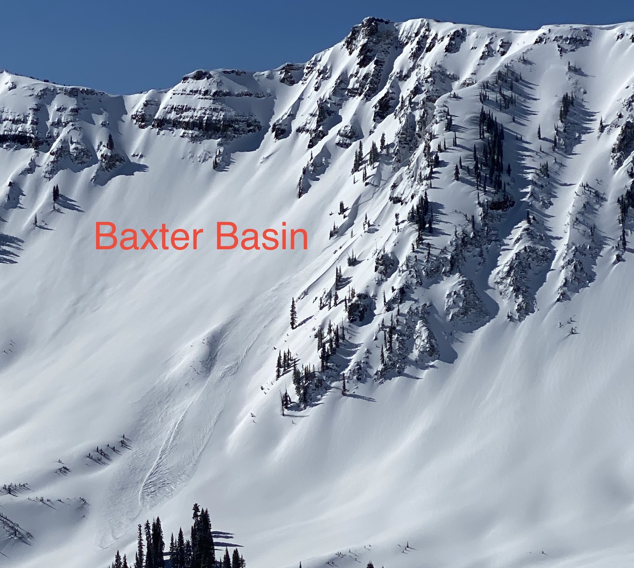 -Baxter Basin size 2 breaking at mid/lower elevation in an East facing couloir feature. Debris ran quite far