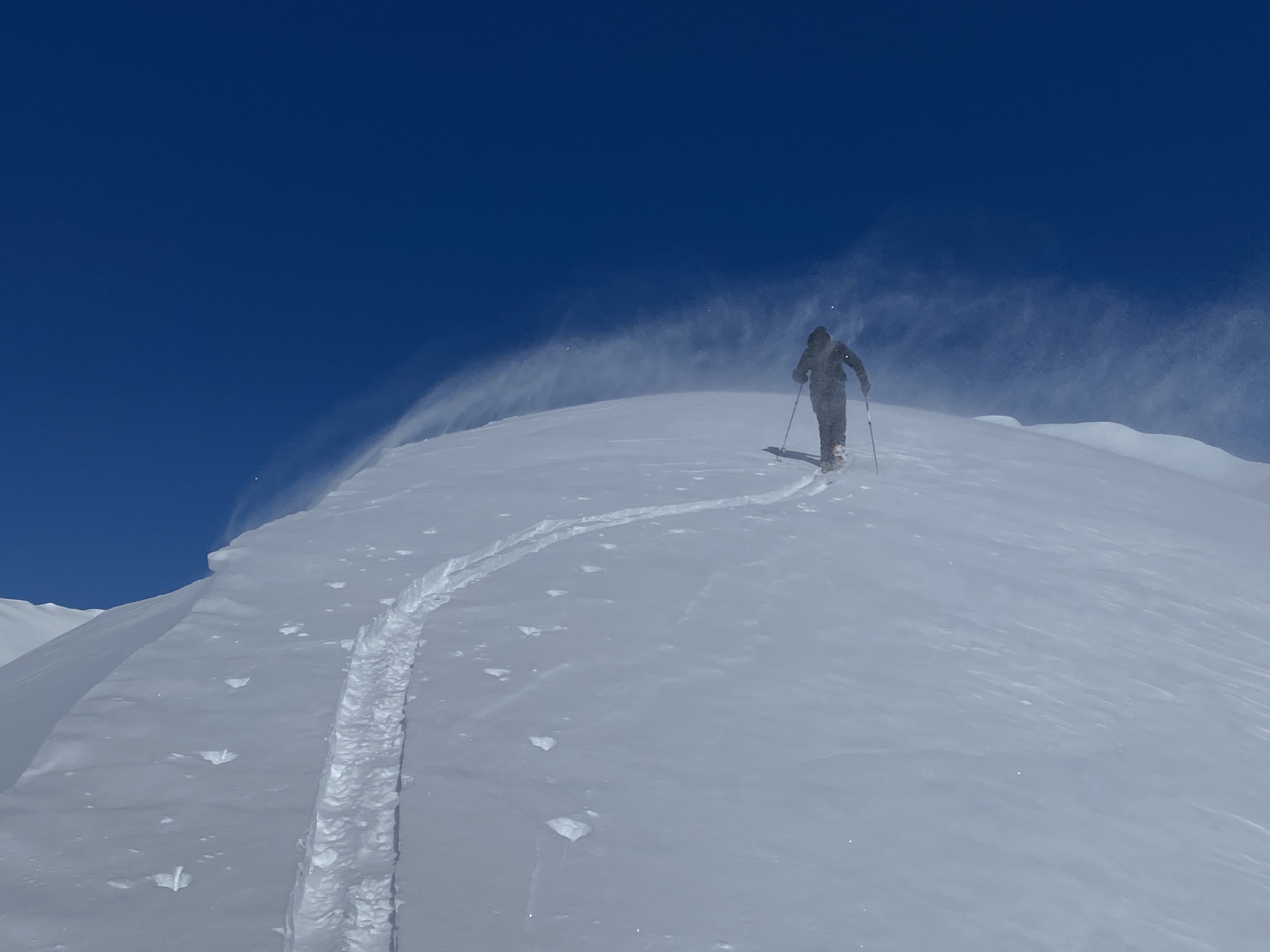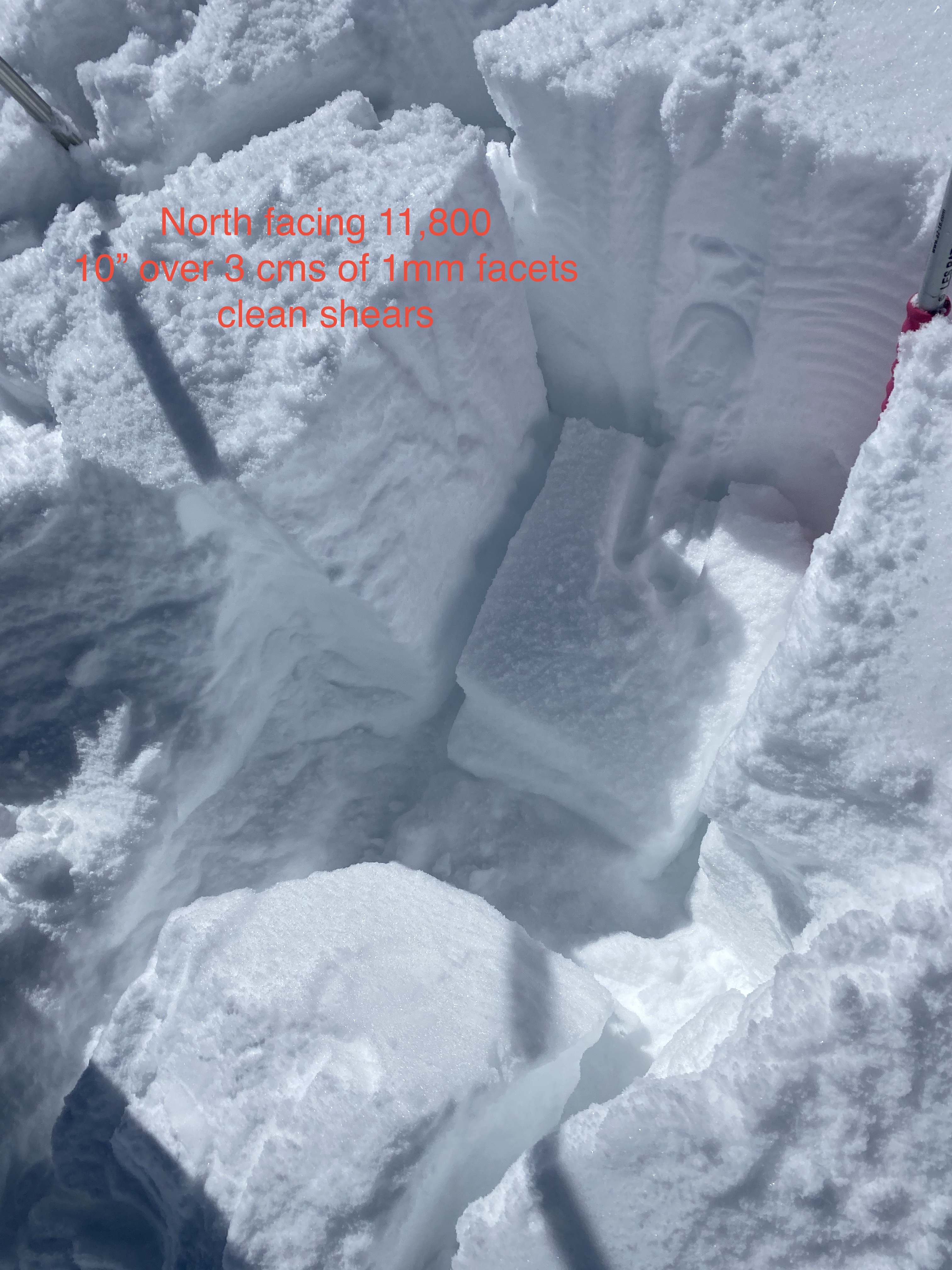 Snowpack: 8-14″ of new snow on average, but winds had loaded/stripped from one place to the next. Couple hand pits showed 10″ new over facets over strong melt freeze or dense old snow depending on aspect. The new slab is up to 4F+ and the facets below 1-1.5mm. No dramatic signs of instability under foot, but the problem is there and easy to find.