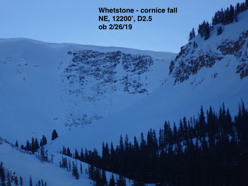-In the AM noticed a fresh cornice fall triggered slab on Whetstone in the hidden lake basin. Sure appears as this thing ran on Monday sometime, D2.5.