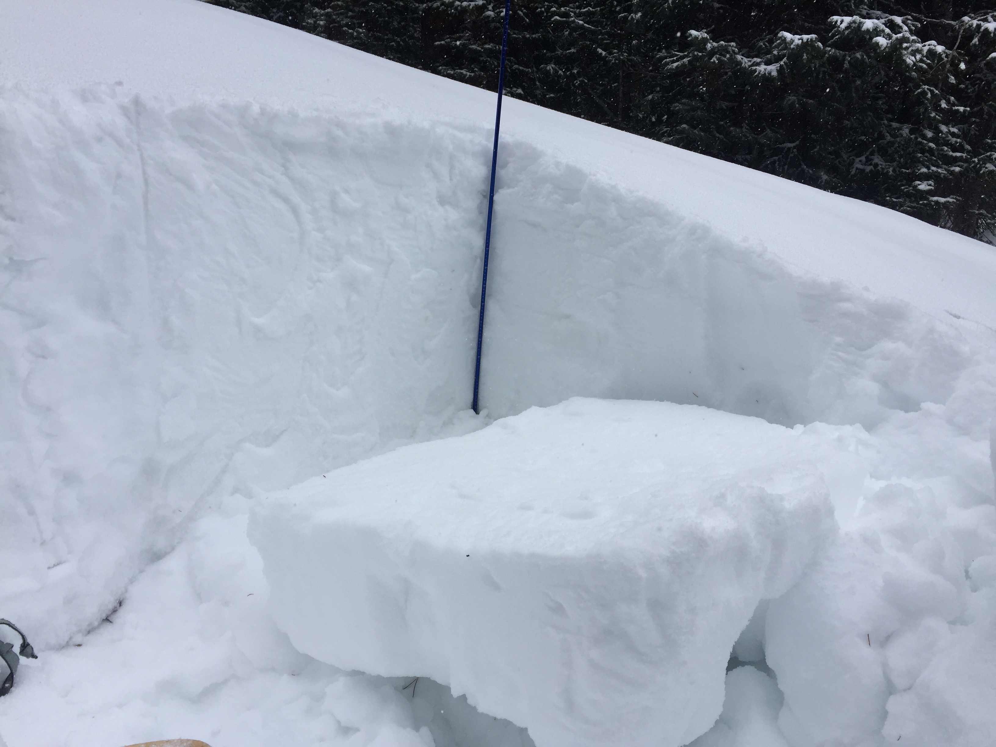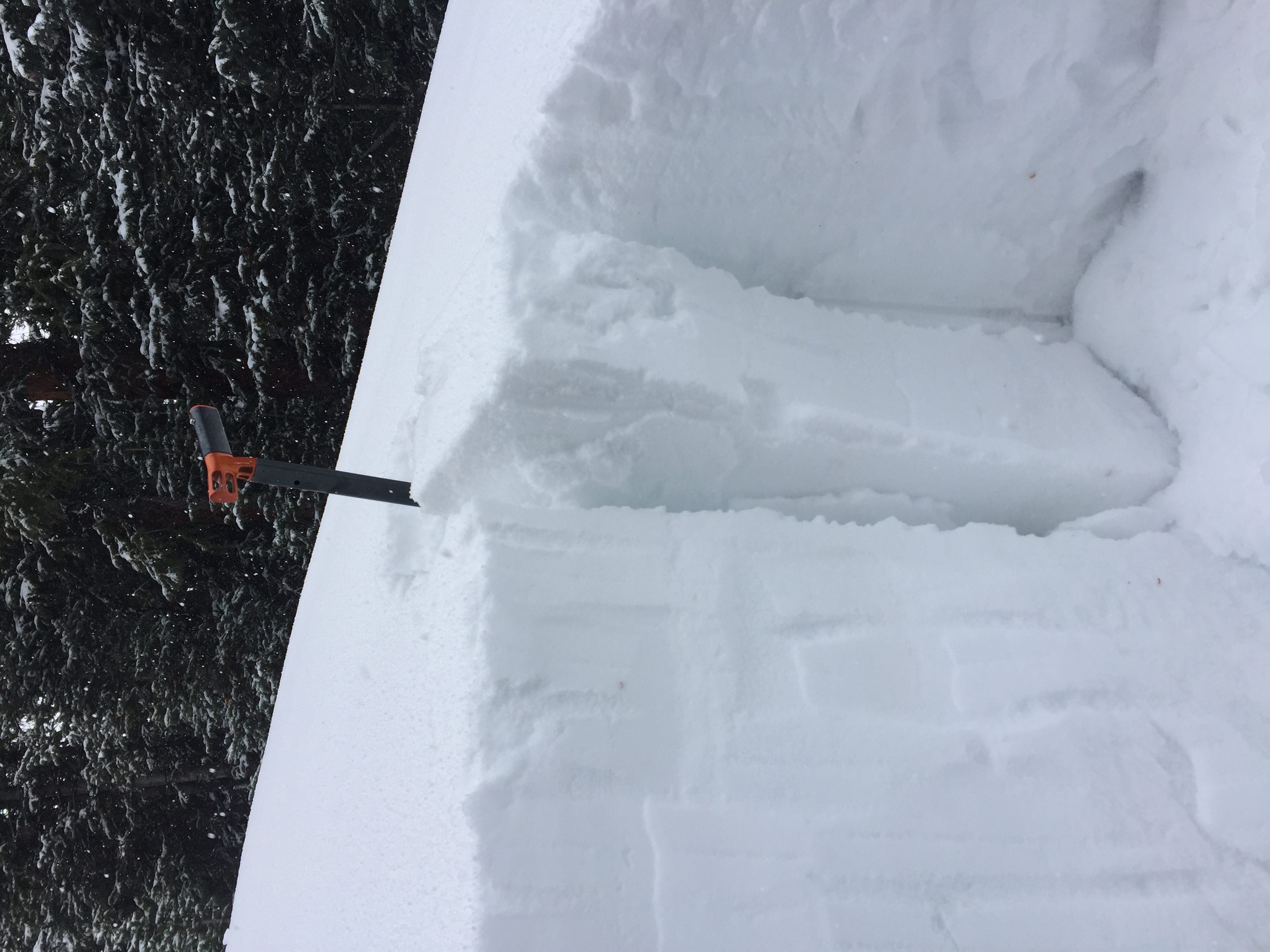 HS 90cm with 10cm of new snow on top of a 15cm windslab on top of 4F-1F midpack. 15cm of faceted snow still present at ground level.