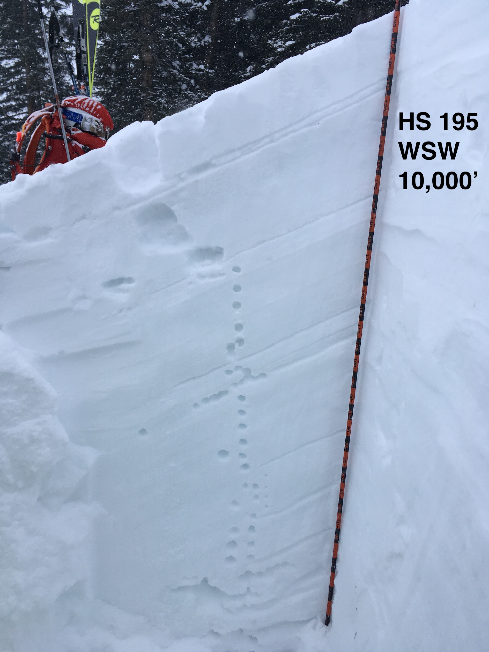 Snowpack: Climbed up through westerly terrain below treeline. In this snow favored part of the range, the average HS was ~190cm. The 1/15 and 1/21 interfaces were rounding and gaining strength; no concerning test results on these layers. Two graupel layers from 2/2 storm and 2/15 still clearly visible but no test results. Of note was a soft 2cm melt/freeze crust that formed during the afternoon on Friday, 2/15 – it was buried by about 18cm of snow from Saturday. ECTN test results on 2/15 and 1/21.