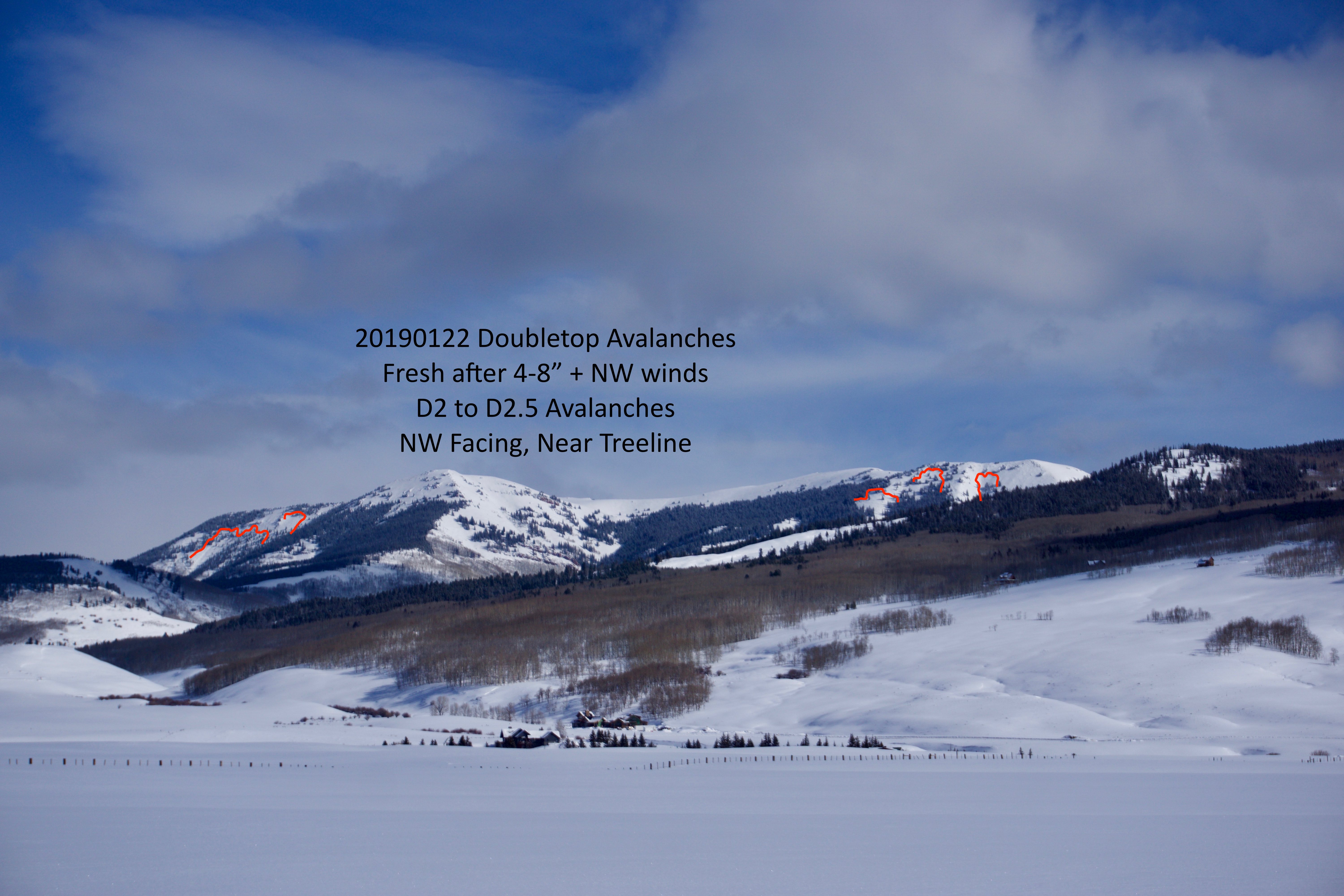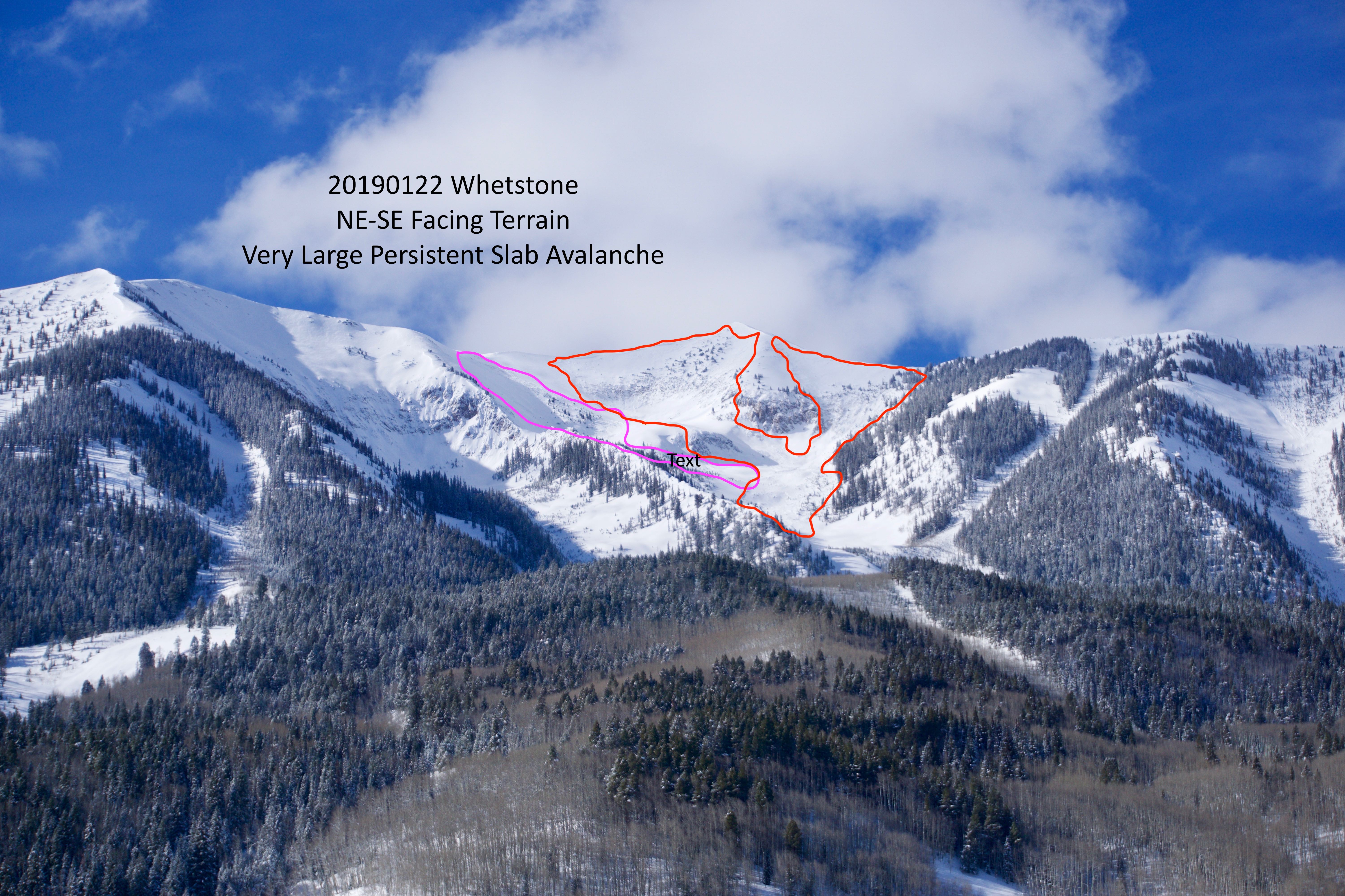 Large to very large avalanches observed on Whetstone (E-SE ATL) fresh overnight (and large sympathetic slide in NE bowl). Also unknown age of the Doubletop avalanches but looked fresh bedsurfaces with binos. W-NW facing NTL terrain. Crown depths look 4-6 feet deep, failing on persistent weak layers and gauging to near ground in places.